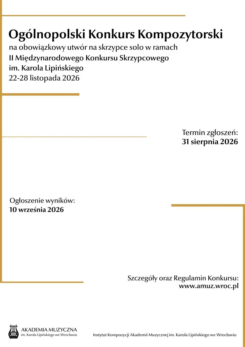 Zapraszamy do wzięcia udziału w Ogólnopolskim Konkursie kompozytorskim na obowiązkowy utwór na skrzypce solo w ramach II Międzynarodowego Konkursu Skrzypcowego im. Karola Lipińskiego (22-28 listopada 2026).