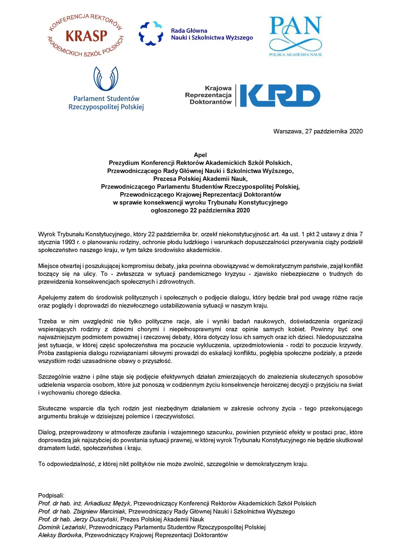 Wspólny apel Prezydium Konferencji Rektorów Akademickich Szkół Polskich, Przewodniczącego Rady Głównej Nauki i Szkolnictwa Wyższego, Prezesa Polskiej Akademii Nauk, Przewodniczącego Parlamentu Studentów Rzeczypospolitej Polskiej, Przewodniczącego Krajowej Reprezentacji Doktorantów w sprawie konsekwencji wyroku Trybunału Konstytucyjnego ogłoszonego 22 października 2020 r.