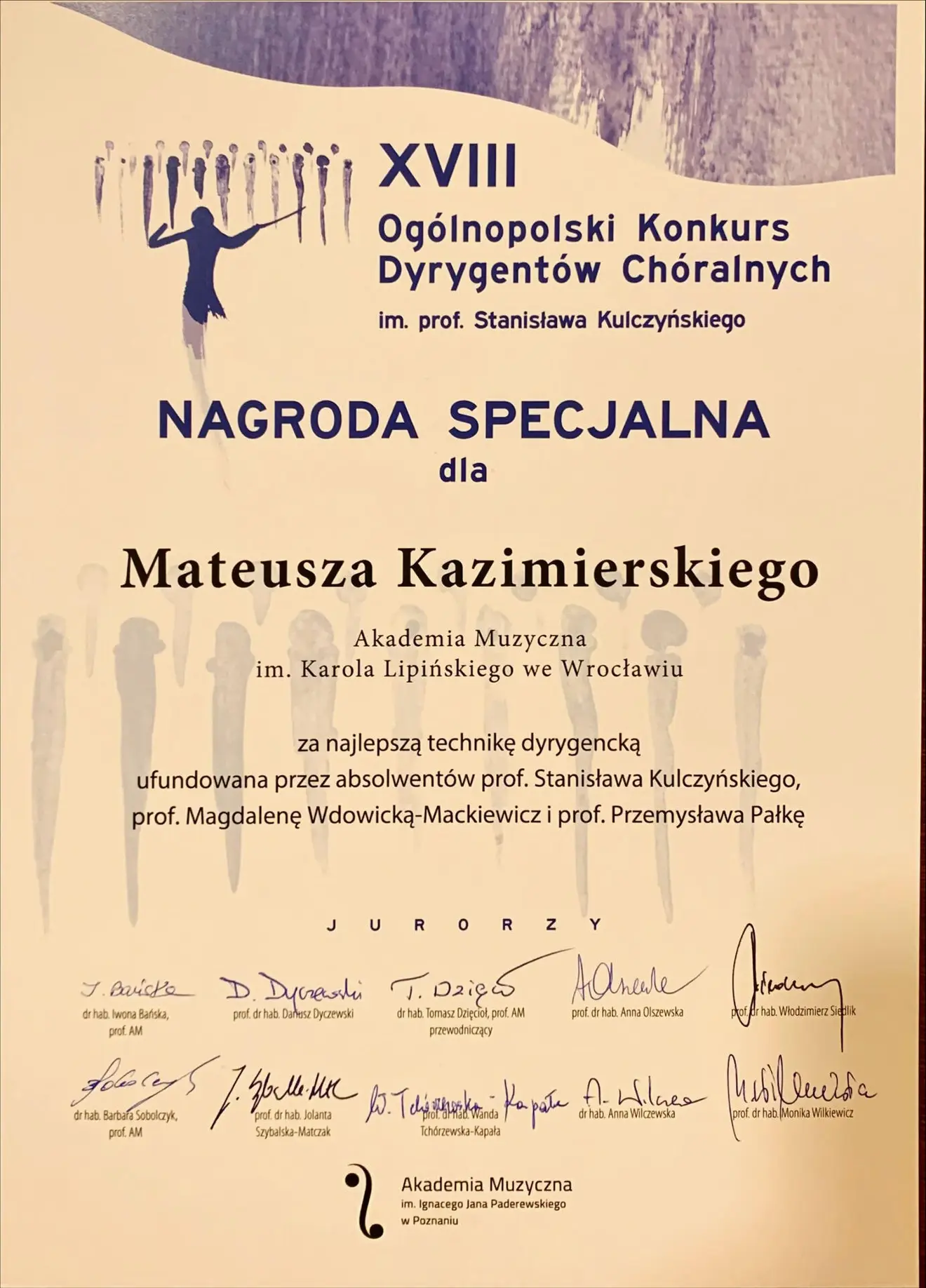 Pragniemy złożyć serdeczne gratulacje Panu Mateuszowi Kazimierskiemu, studentowi klasy dyrygentury chóralnej dra hab. Artura Wróbla, prof. AMKL, który otrzymał I Nagrodę i aż pięć Nagród Specjalnych, Panu Michałowi Plichcie – laureatowi III Nagrody, studentowi klasy dyrygentury prof. dra hab. Alana Urbanka oraz klasy dyrygentury chóralnej prof. dr hab. Magdaleny Wdowickiej-Mackiewicz oraz Pani Karinie Reske, studentce klasy dyrygentury chóralnej pr