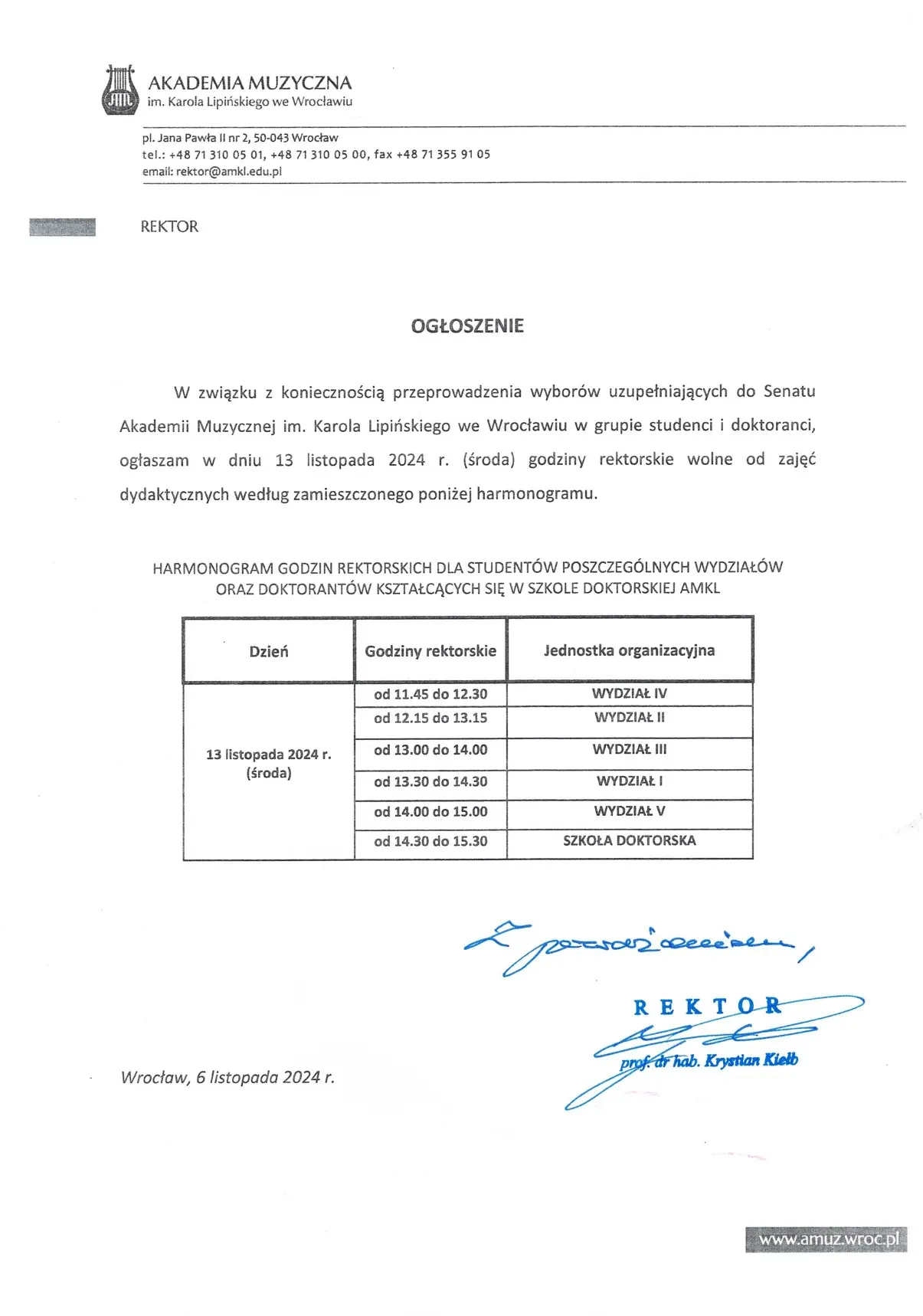 W związku z koniecznością przeprowadzenia wyborów uzupełniających do Senatu Akademii Muzycznej im. Karola Lipińskiego we Wrocławiu w grupie studentów i doktorantów, Rektor AMKL prof. dr hab. Krystian Kiełb ogłasza w dniu 13 listopada 2024 roku (środa) godziny rektorskie wolne od zajęć dydaktycznych.