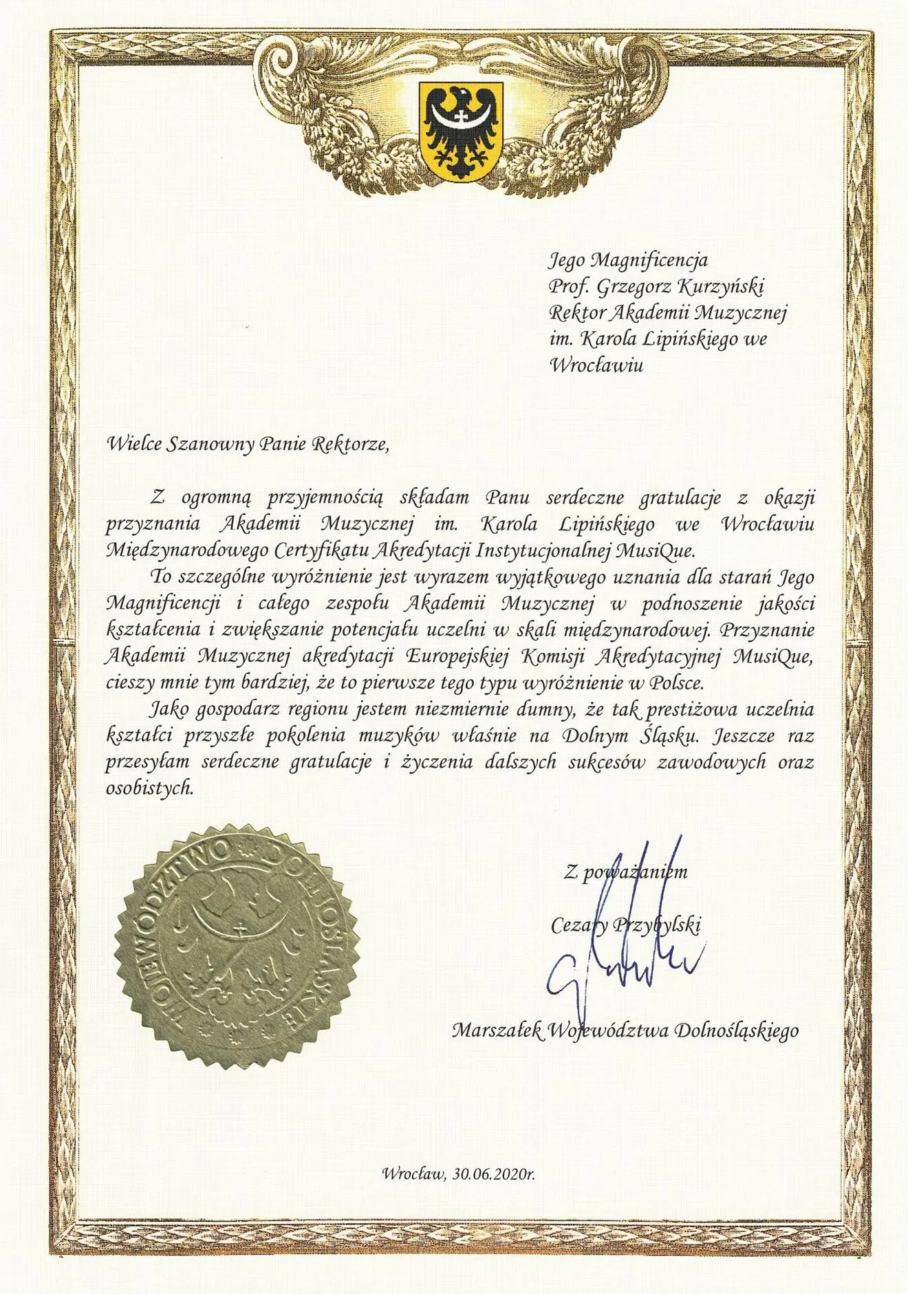 Gratulacje od Marszałka Województwa Dolnośląskiego dla Akademii Muzycznej im. Karola Lipińskiego we Wrocławiu