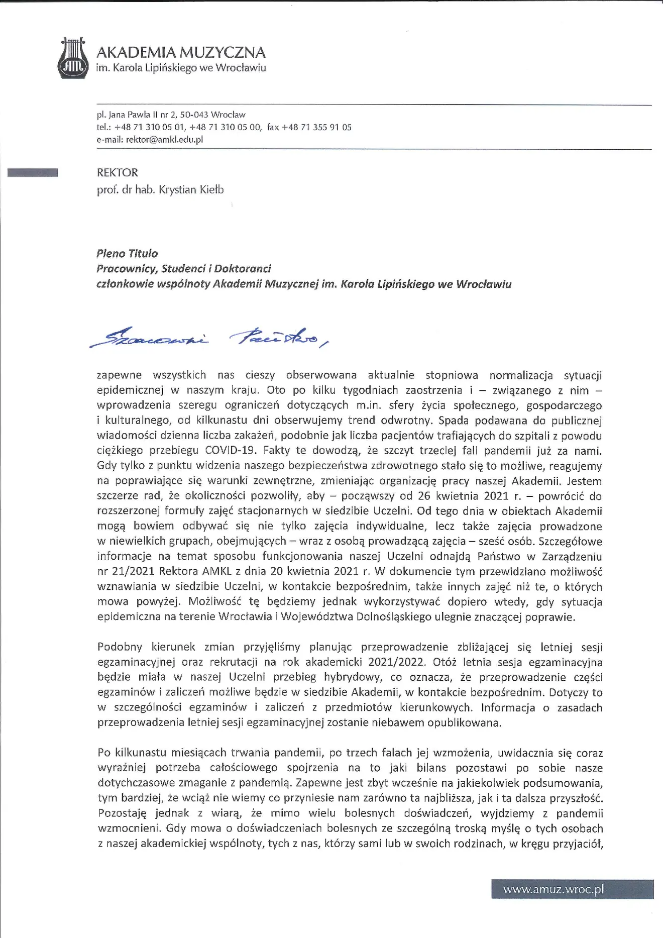 List JM Rektora do P.T. członków wspólnoty AMKL z dnia 27 kwietnia 2021 r.