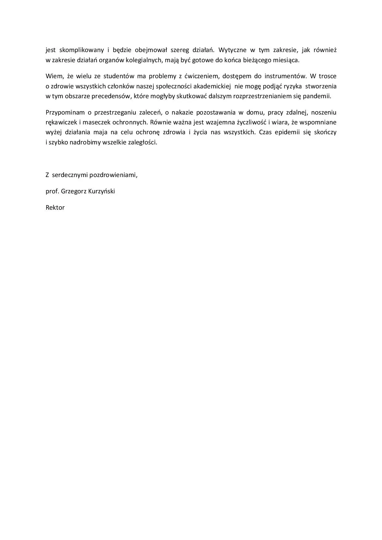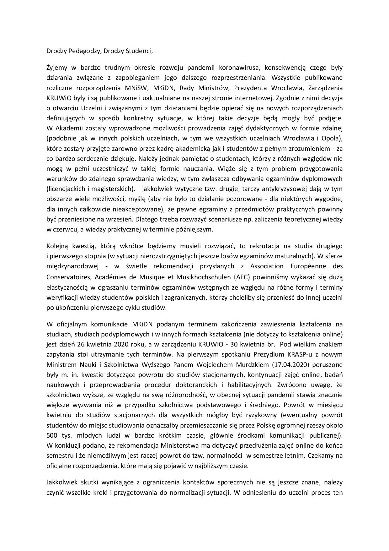 List otwarty JM Rektora prof. Grzegorza Kurzyńskiego do całej społeczności Akademii Muzycznej im. Karola Lipińskiego we Wrocławiu z dnia 22.04.2020 r.