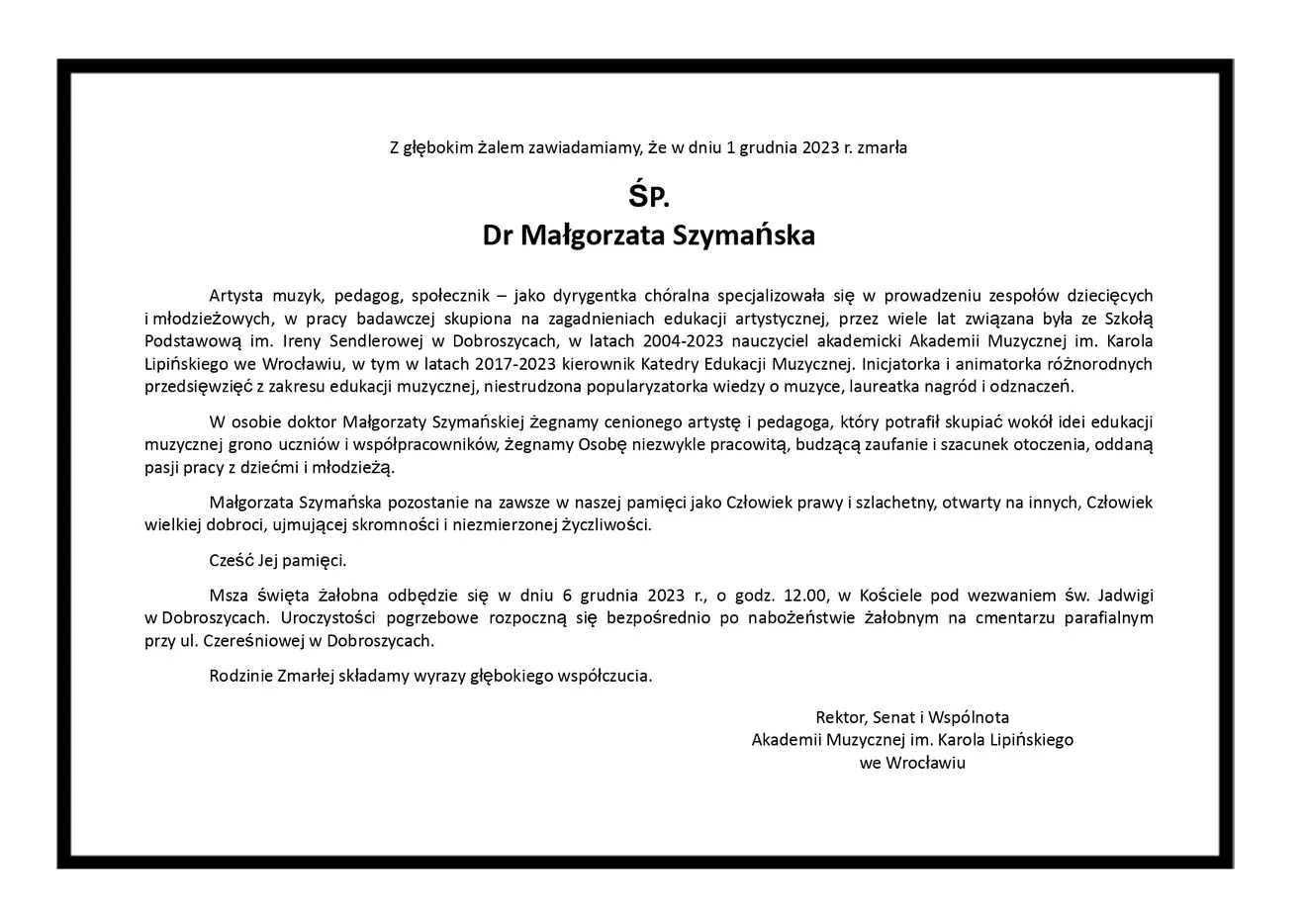Odeszła ŚP. dr Małgorzata Szymańska. Msza święta żałobna odbędzie się w dniu 6 grudnia 2023 r., o godz. 12.00, w Kościele pod wezwaniem św. Jadwigi w Dobroszycach.