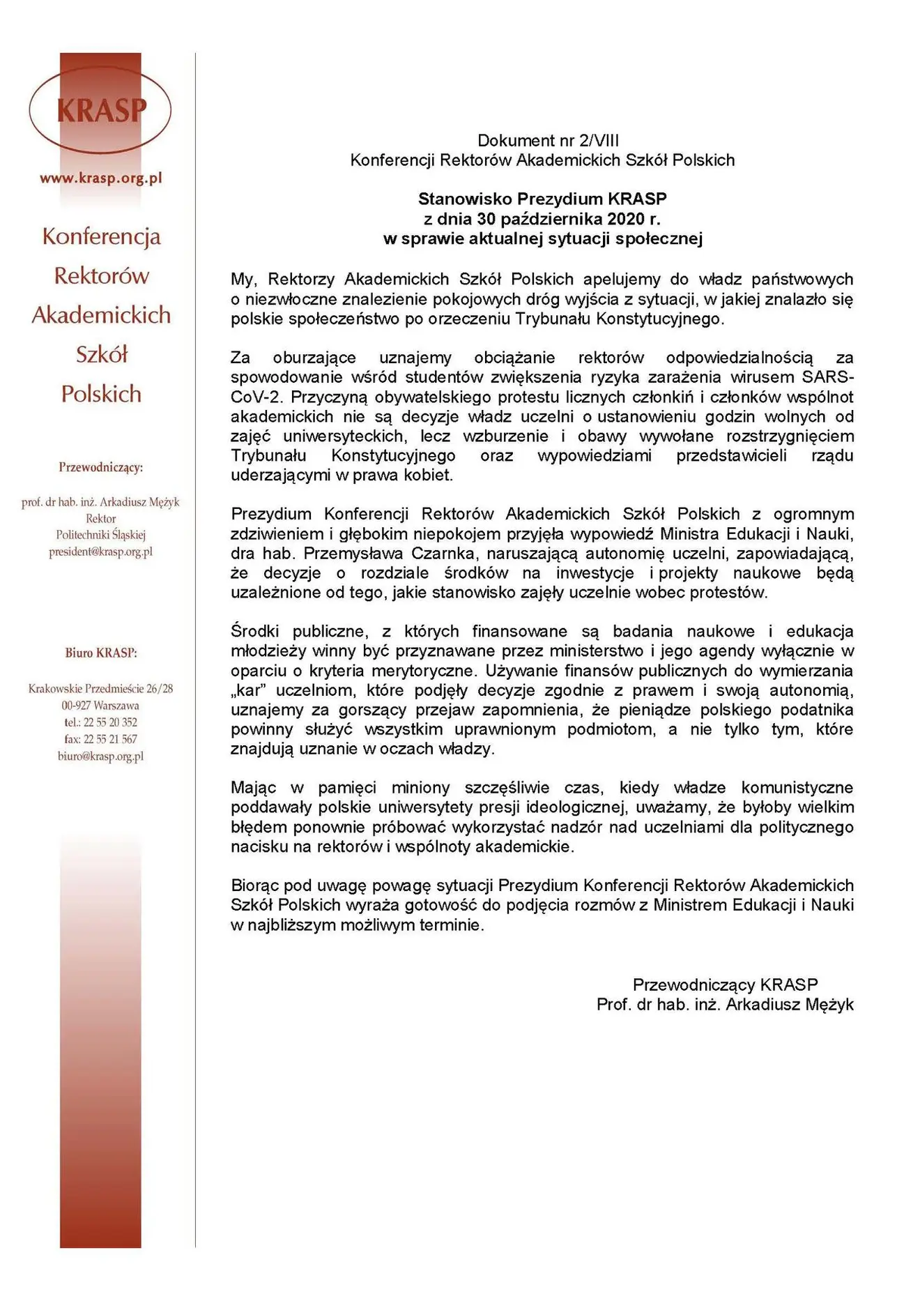 Stanowisko Prezydium KRASP z 30 października 2020 r. w sprawie aktualnej sytuacji społecznej, apel uczestników nadzwyczajnego posiedzenia Prezydium KRASP do wspólnot akademickich z 30 października 2020 r. oraz apel gremiów akademickich w sprawie wyroku TK z 22 października 2020 r.