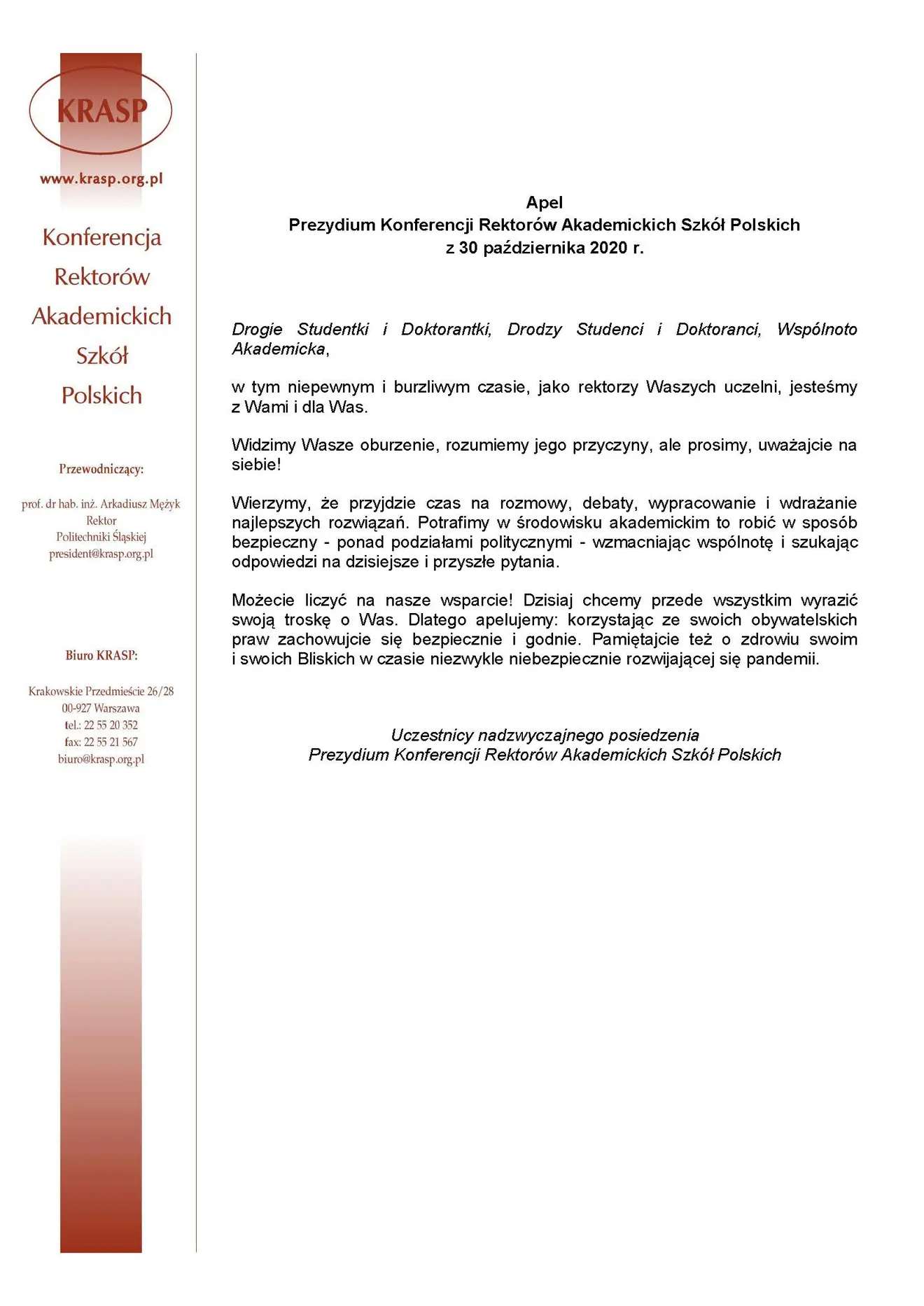 Apel uczestników nadzwyczajnego posiedzenia Prezydium KRASP do wspólnot akademickich z 30 października 2020 r.