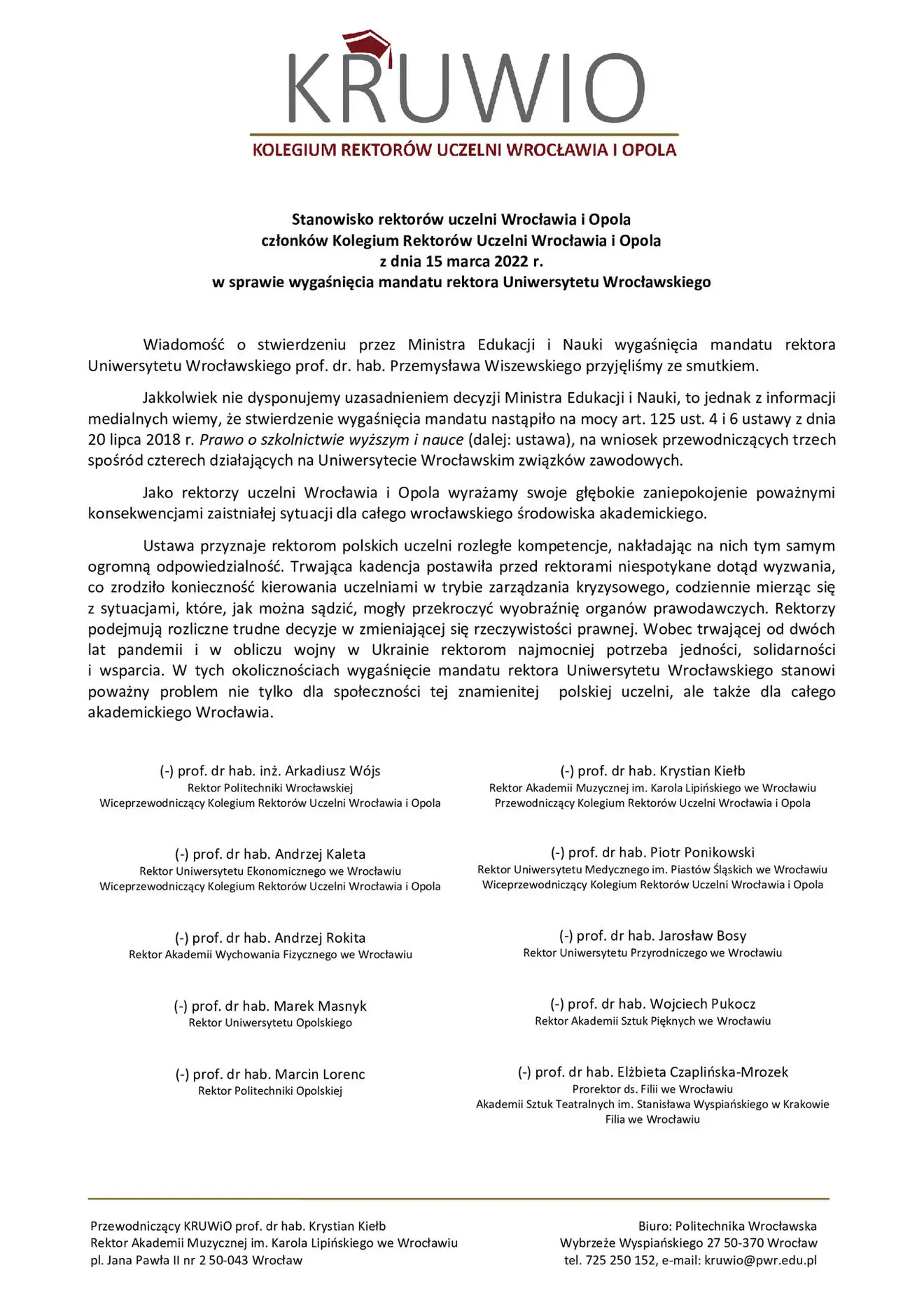 Stanowisko Kolegium Rektorów Uczelni Wrocławia i Opola w sprawie wygaśnięcia mandatu Rektora Uniwersytetu Wrocławskiego prof. dr. hab. Przemysława Wiszewskiego.