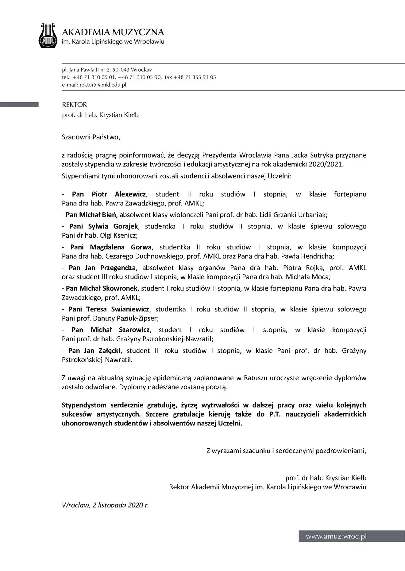 Studenci i absolwenci naszej Uczelni zostali uhonorowani  przez Prezydenta Wrocławia Pana Jacka Sutryka stypendiami w zakresie twórczości i edukacji artystycznej na rok akademicki 2020/2021.
