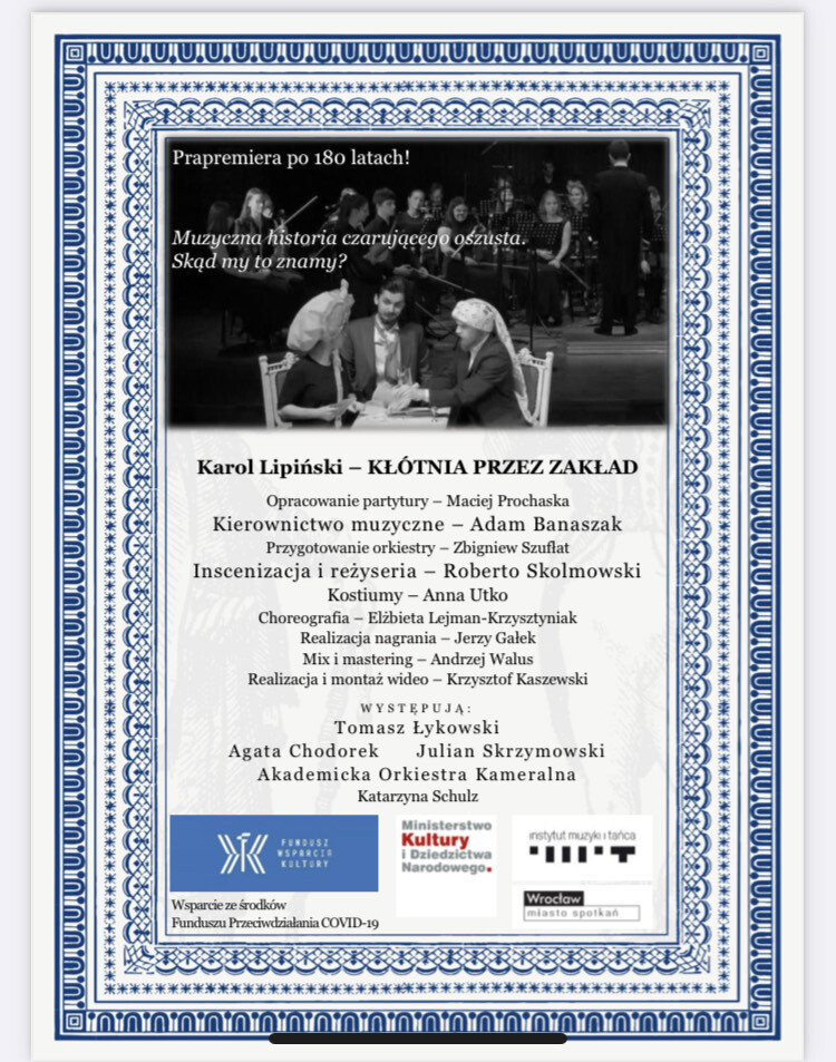 Towarzystwo Teatralne we współpracy z Akademią Muzyczną im. Karola Lipińskiego we Wrocławiu i Polskim Stowarzyszeniem Pedagogów Śpiewu po raz kolejny zrealizowało nagranie i wydanie płyty DVD. "Kłótnia przez zakład", dzieło wybitnego polskiego kompozytora Karola Lipińskiego, uznawane było za zaginione, zostało wydane pod patronatem RMF Classic. Jest to współczesna premiera.