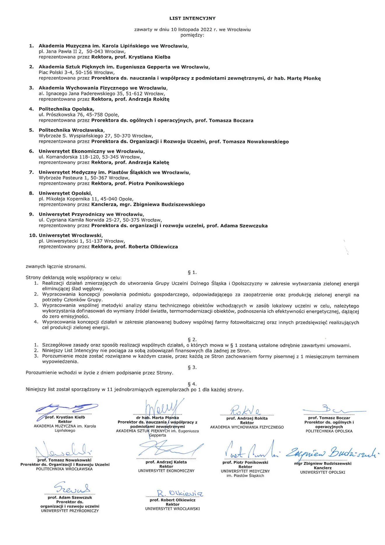 Podczas spotkania przewodniczący Kolegium Rektorów Uniwersytetów Wrocławia i Opola, rektor Akademii Muzycznej im. Karola Lipińskiego we Wrocławiu, prof. Krystian Kiełb, dziękując rektorowi Uniwersytetu Wrocławskiego, prof. Robertowi Olkiewiczowi za inicjatywę, dodał: życzę nam wszystkim, aby projekt ten udało się zrealizować tak, jak planujemy, abyśmy z perspektywy wielu lat wspominali tę chwilę jako moment o doniosłym znaczeniu dla wszystkich naszych uczelni.