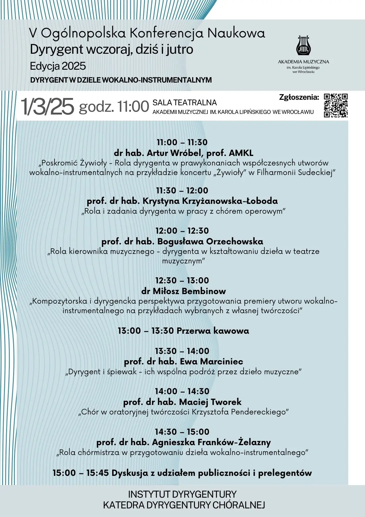 W dniu 1.03.2025 r. w Akademii Muzycznej im. Karola Lipińskiego odbyła się V Ogólnopolska Konferencja Naukowa "Dyrygent wczoraj, dziś i jutro". Edycja 2025 odbyła się pod hasłem "Dyrygent w dziele wokalno-instrumentalnym" i stanowiła doskonałą okazję do zgłębienia roli dyrygenta w interpretacji i wykonawstwie muzyki wokalno-instrumentalnej.
