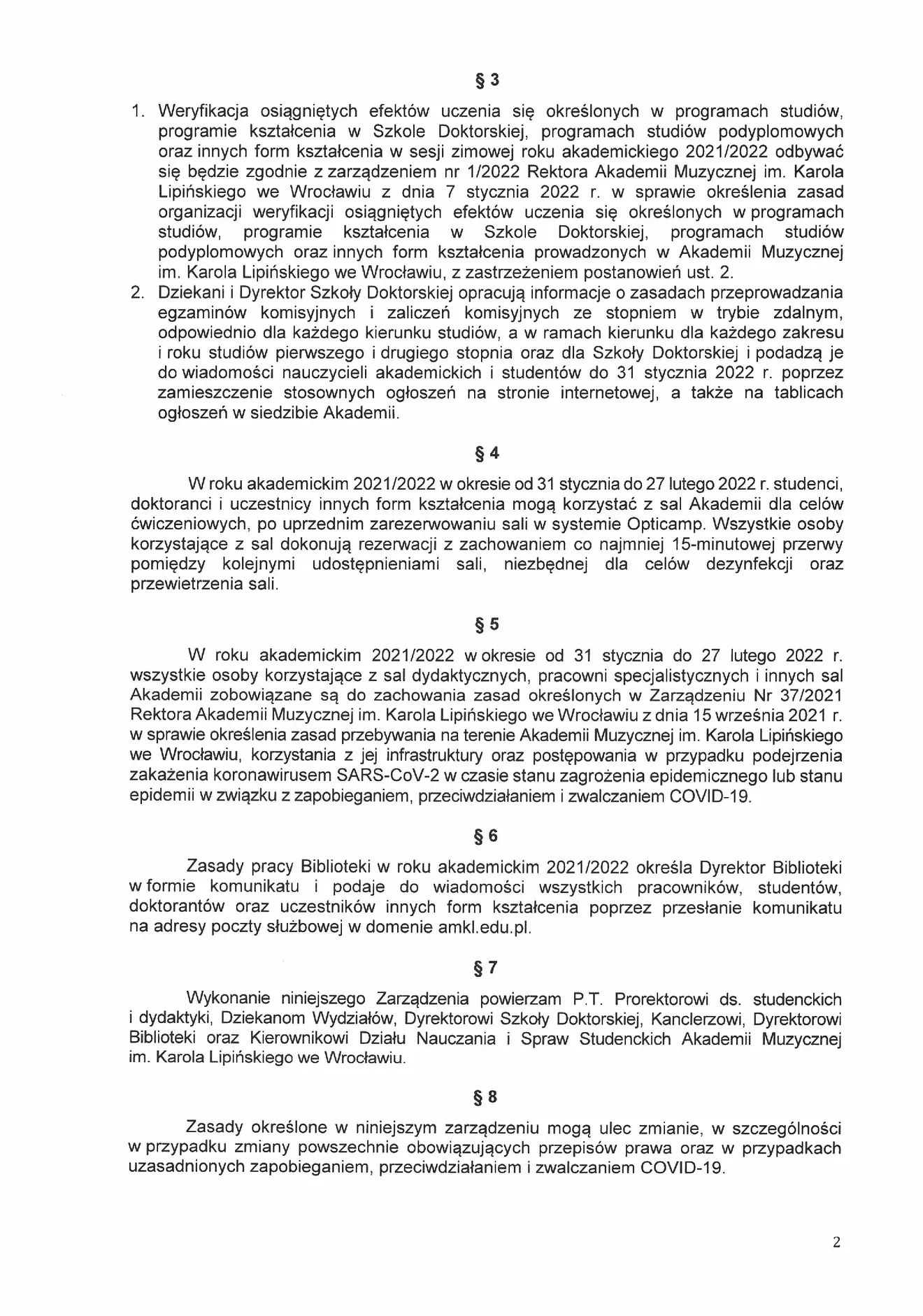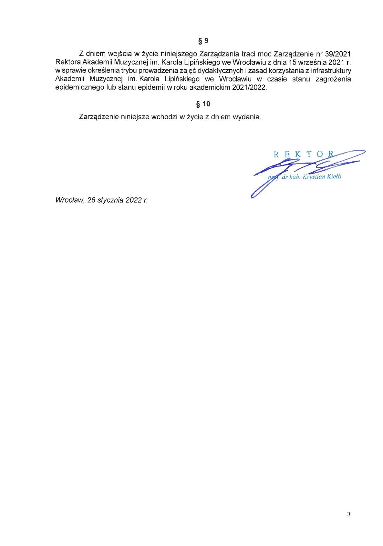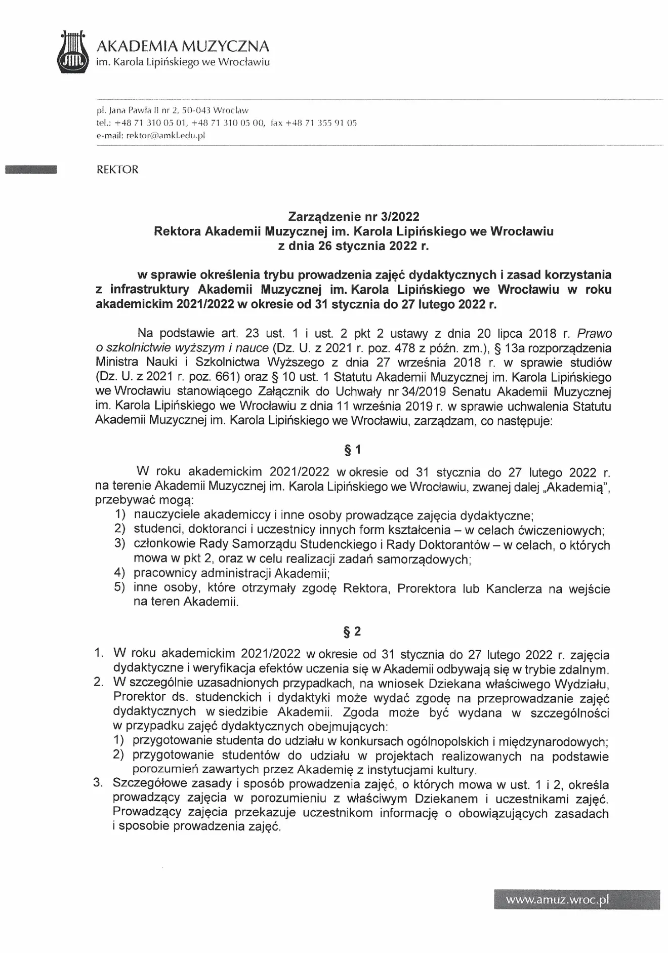 Zarządzenie Rektora nr 3-2022 Określenie trybu prowadzenia zajęć dydaktycznych 31.01-27.02.2022 r..pdf