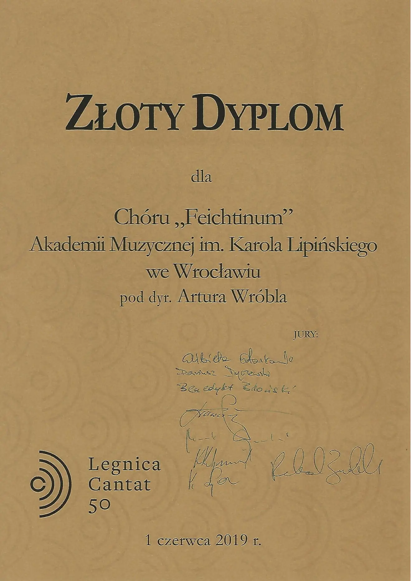 Chór "Feichtinum" Akademii Muzycznej im. Karola Lipińskiego pod dyrekcją dr hab. Artula Wróbla otrzymał Złoty Dyplom.