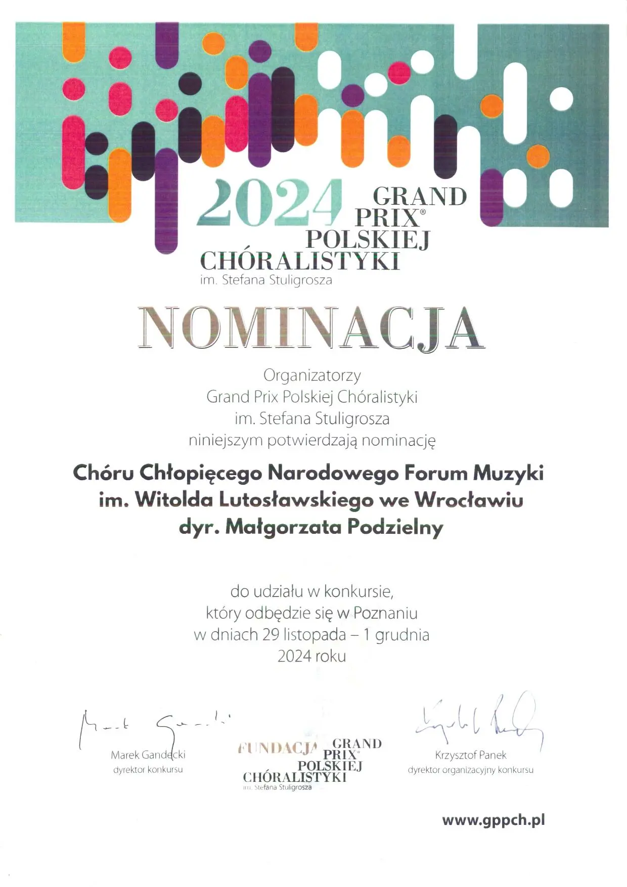 - Nominację do udziału w konkursie „GRAND PRIX POLSKIEJ CHÓRALISTYKI im. Stefana Stuligrosza” w 2024 roku w Poznaniu.