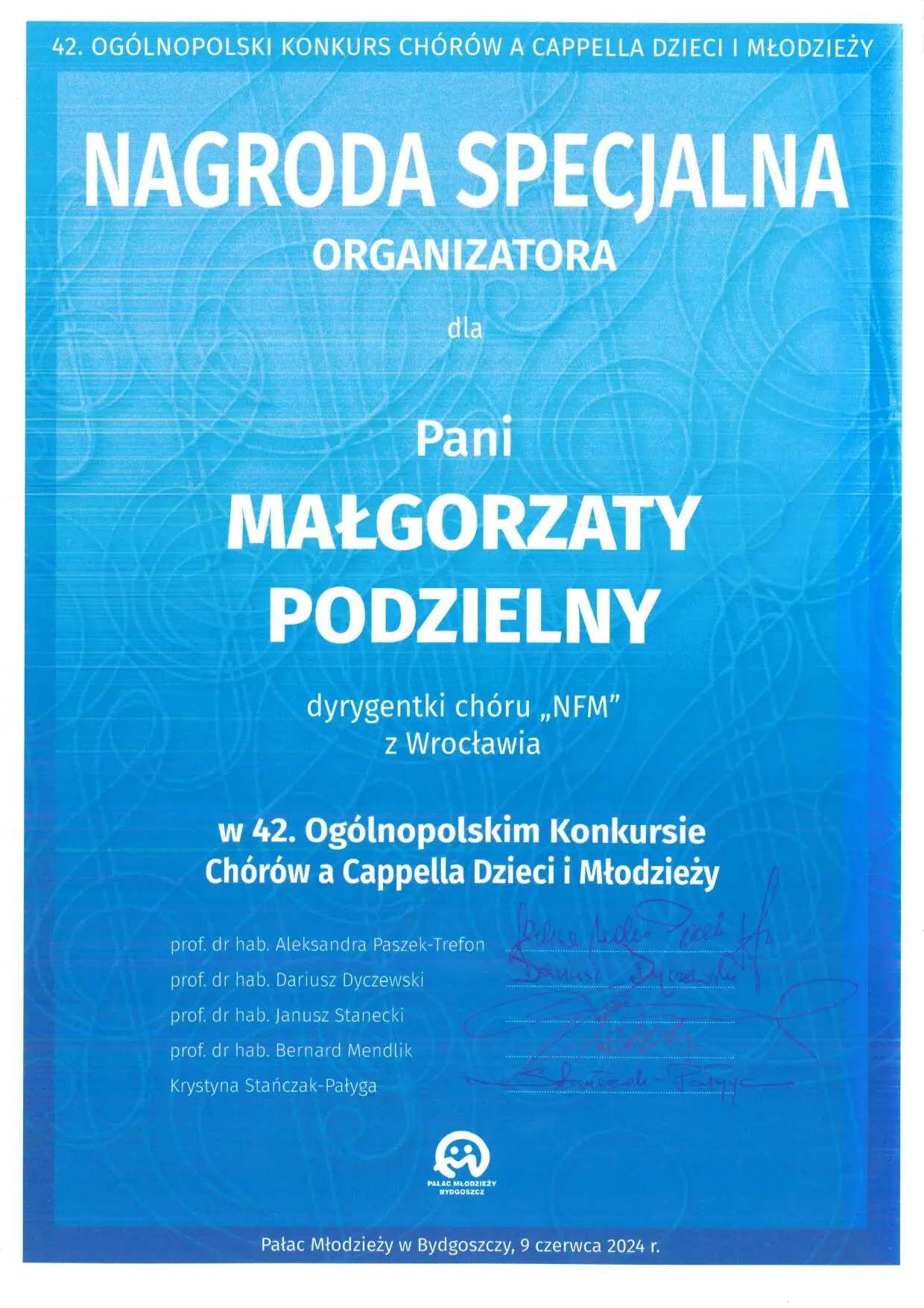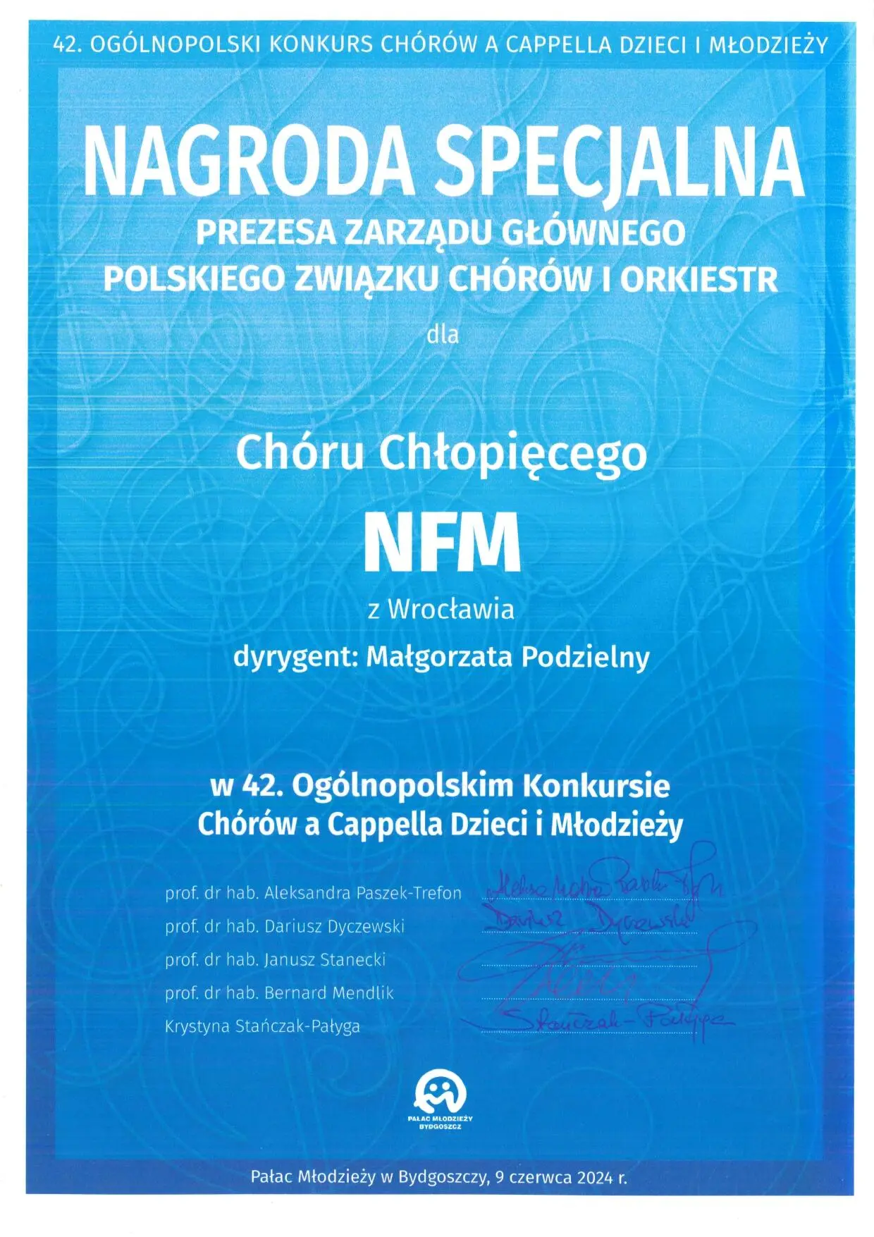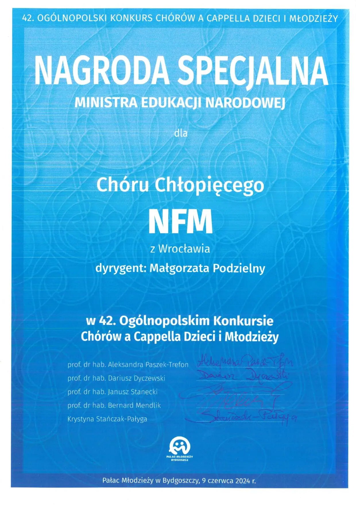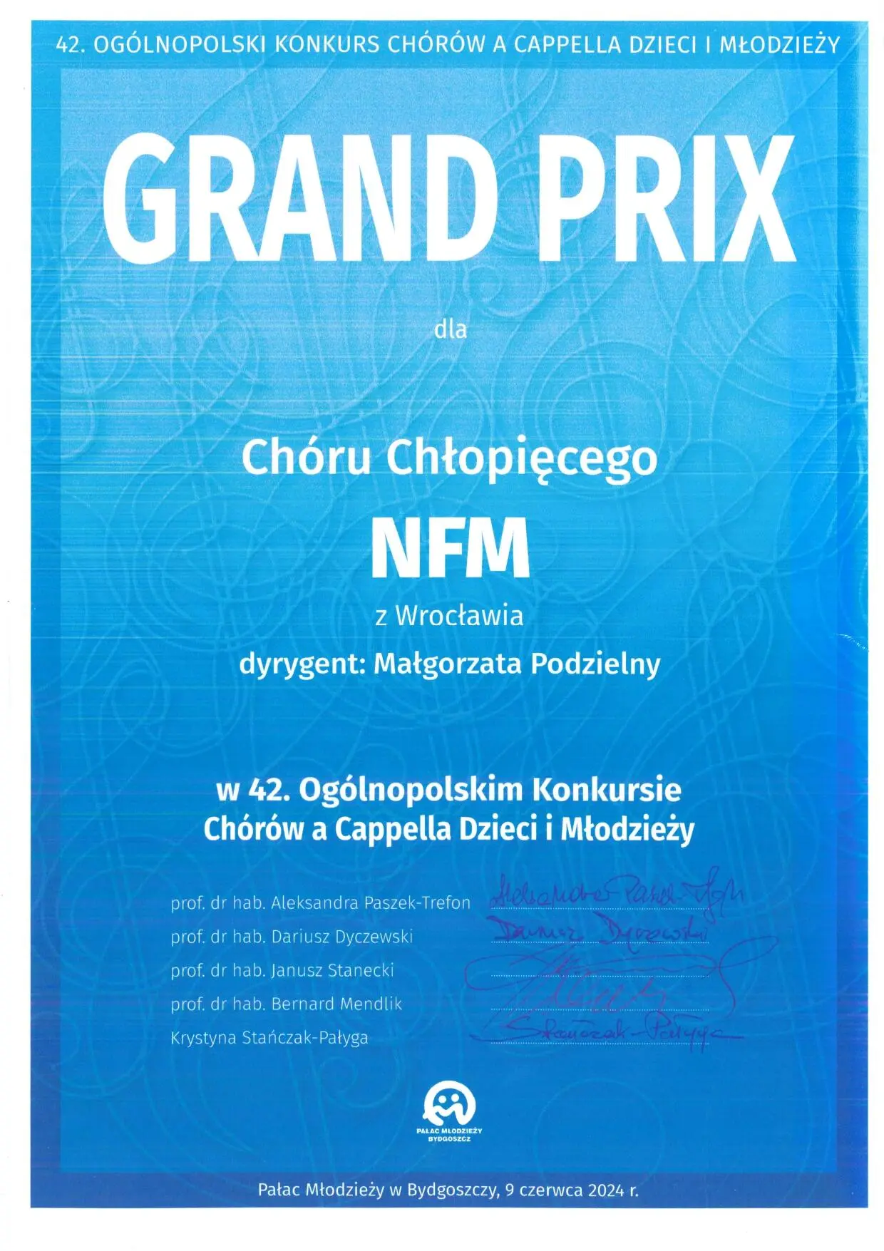 Dr hab. Małgorzata Podzielny, prof. AMKL, wraz z Chórem Chłopięcym NFM Narodowe Forum Muzyki, zdobyła następujące nagrody w 42. Ogólnopolskim Konkursie Chórów a Cappella Dzieci i Młodzieży w Bydgoszczy (7-9 czerwca):
