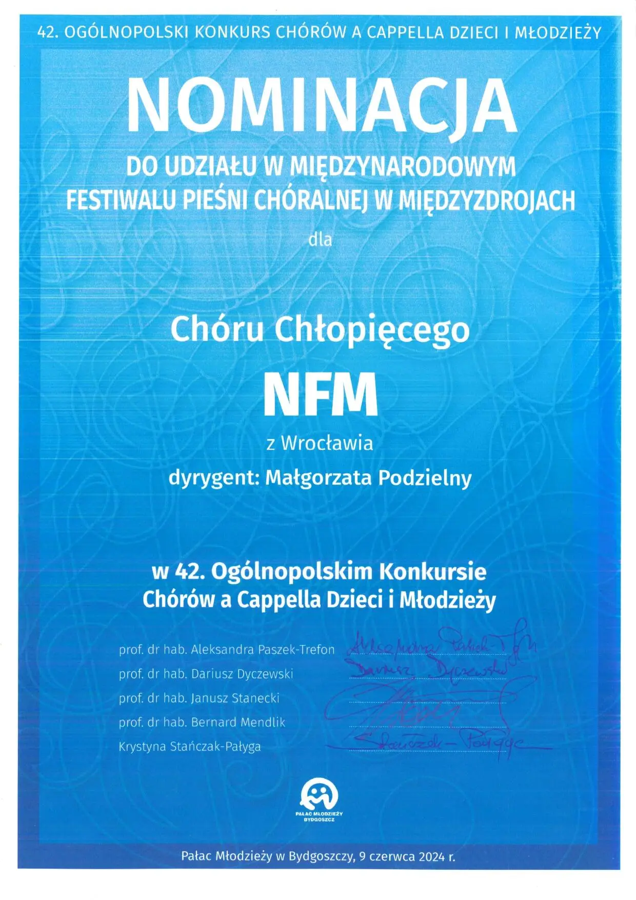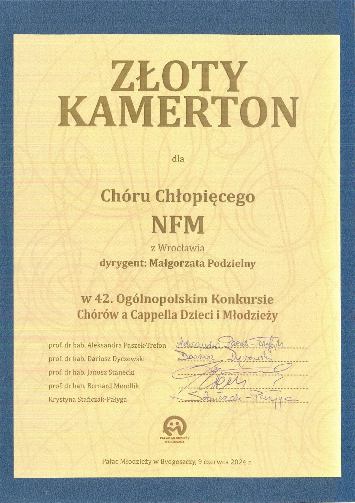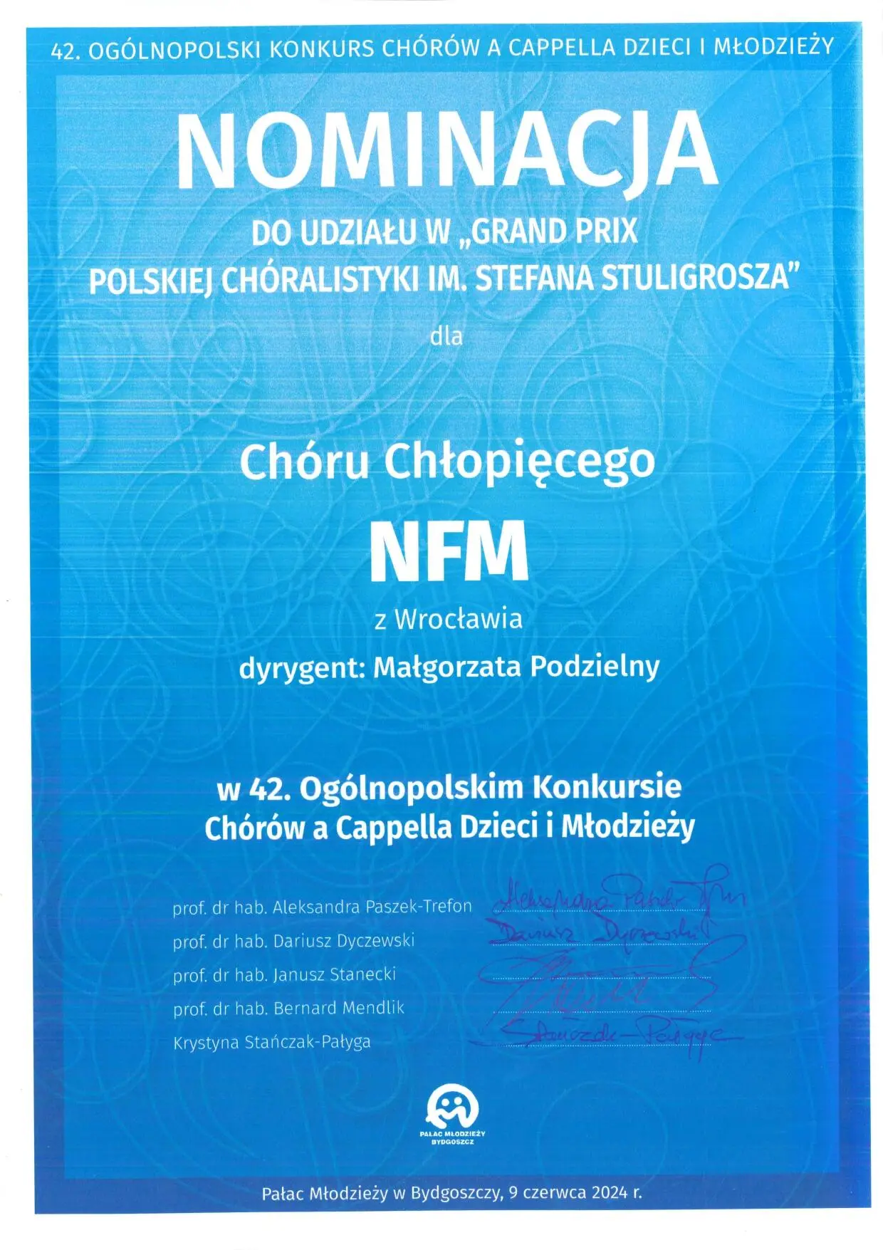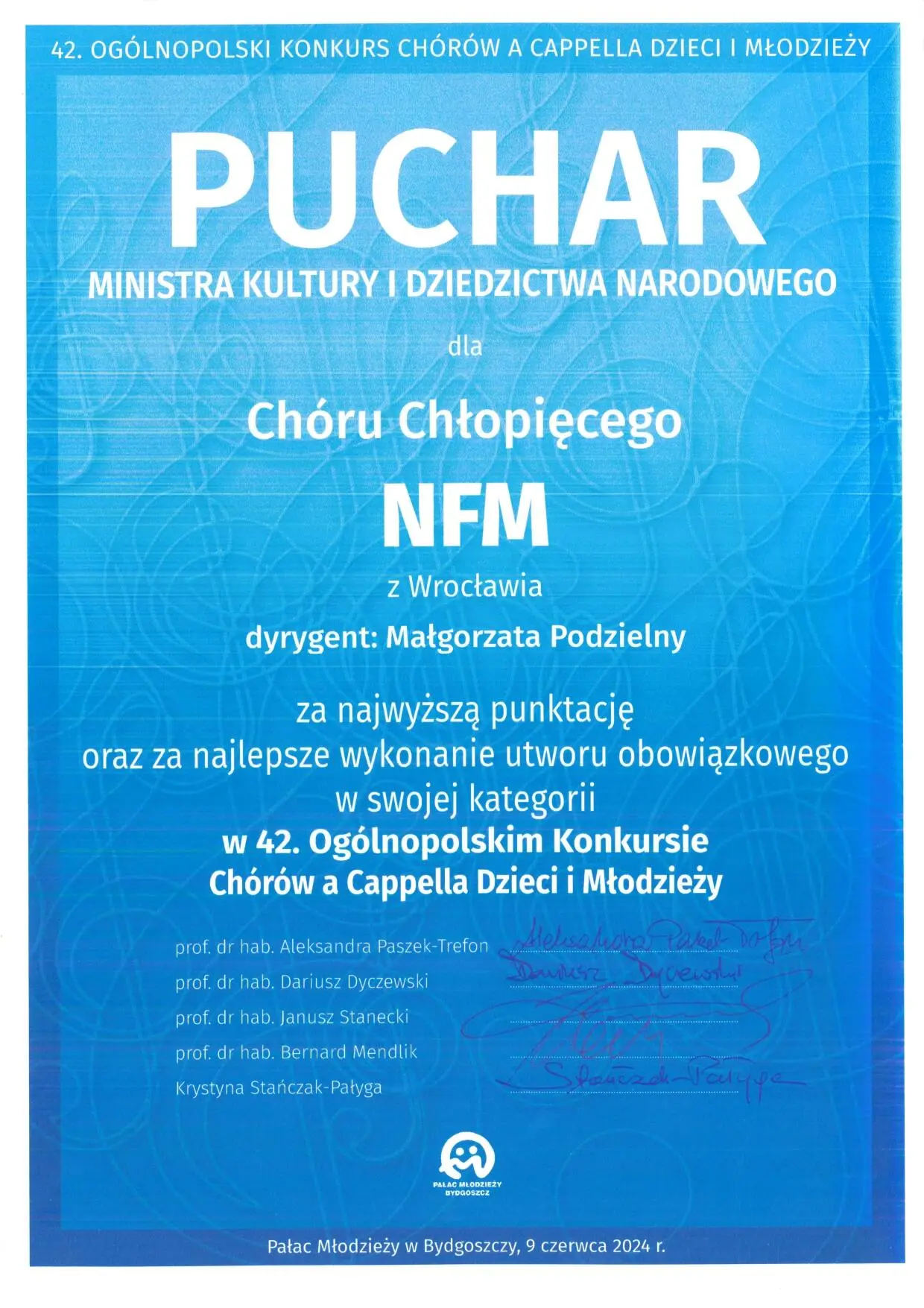 Dr hab. Małgorzata Podzielny, prof. AMKL, wraz z Chórem Chłopięcym NFM Narodowe Forum Muzyki, zdobyła następujące nagrody w 42. Ogólnopolskim Konkursie Chórów a Cappella Dzieci i Młodzieży w Bydgoszczy (7-9 czerwca):