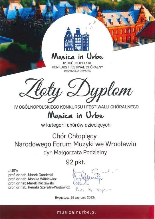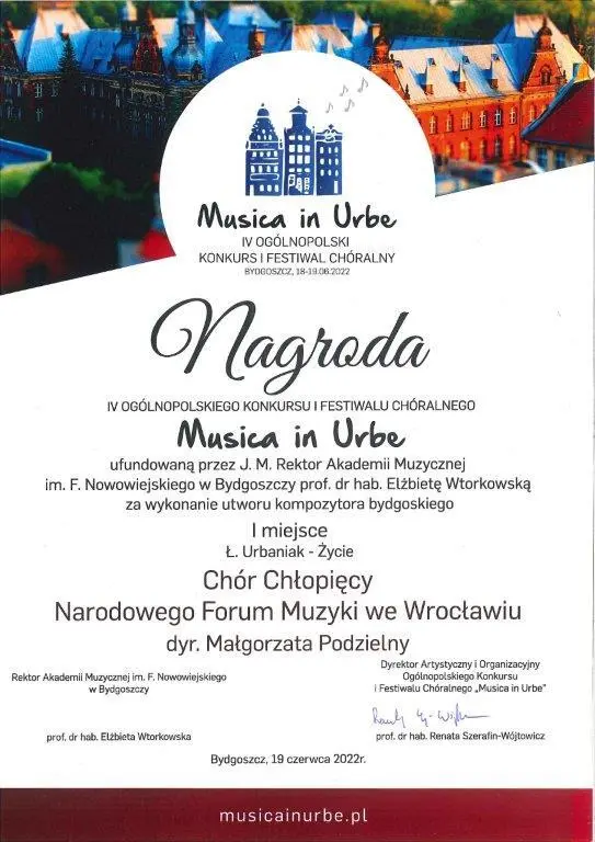 Dr Małgorzata Podzielny wraz z Chórem Chłopięcym Narodowego Forum Muzyki została wyróżniona licznymi nagrodami, w tym za zwycięstwo w kategorii chórów dziecięcych podczas IV Ogólnopolskiego Konkursu i Festiwalu Chóralnego Musica In Urbe 2022.