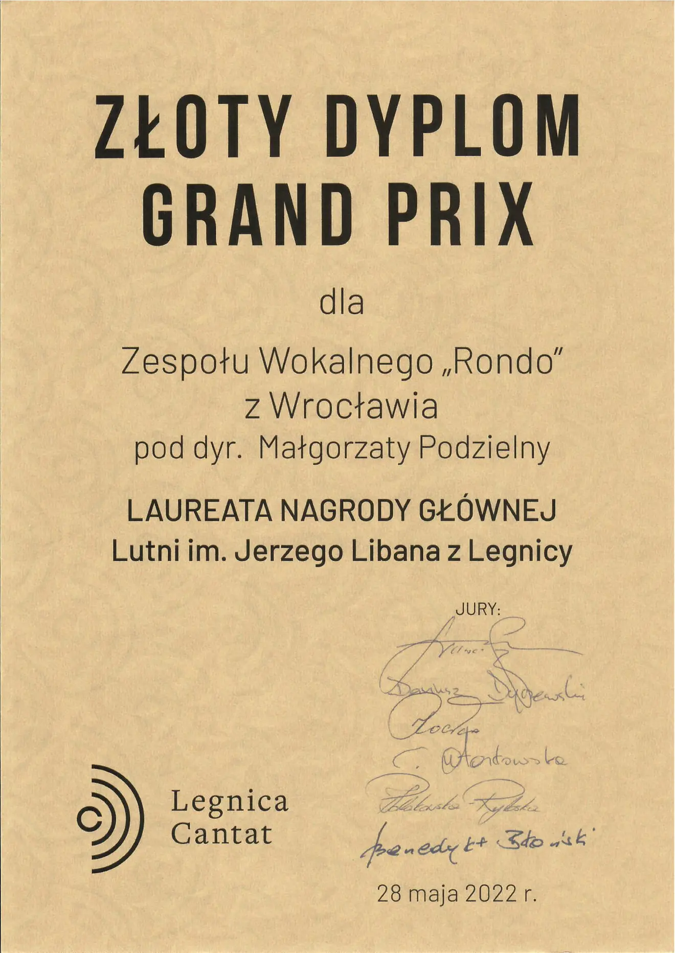 Zespół Wokalny „Rondo” Szkoły Muzycznej I st. im. Grażyny Bacewicz we Wrocławiu pod dyrekcją dr hab. Małgorzaty Podzielny zwyciężył 52. edycję turnieju Legnica Cantat Festiwal Chóralny.