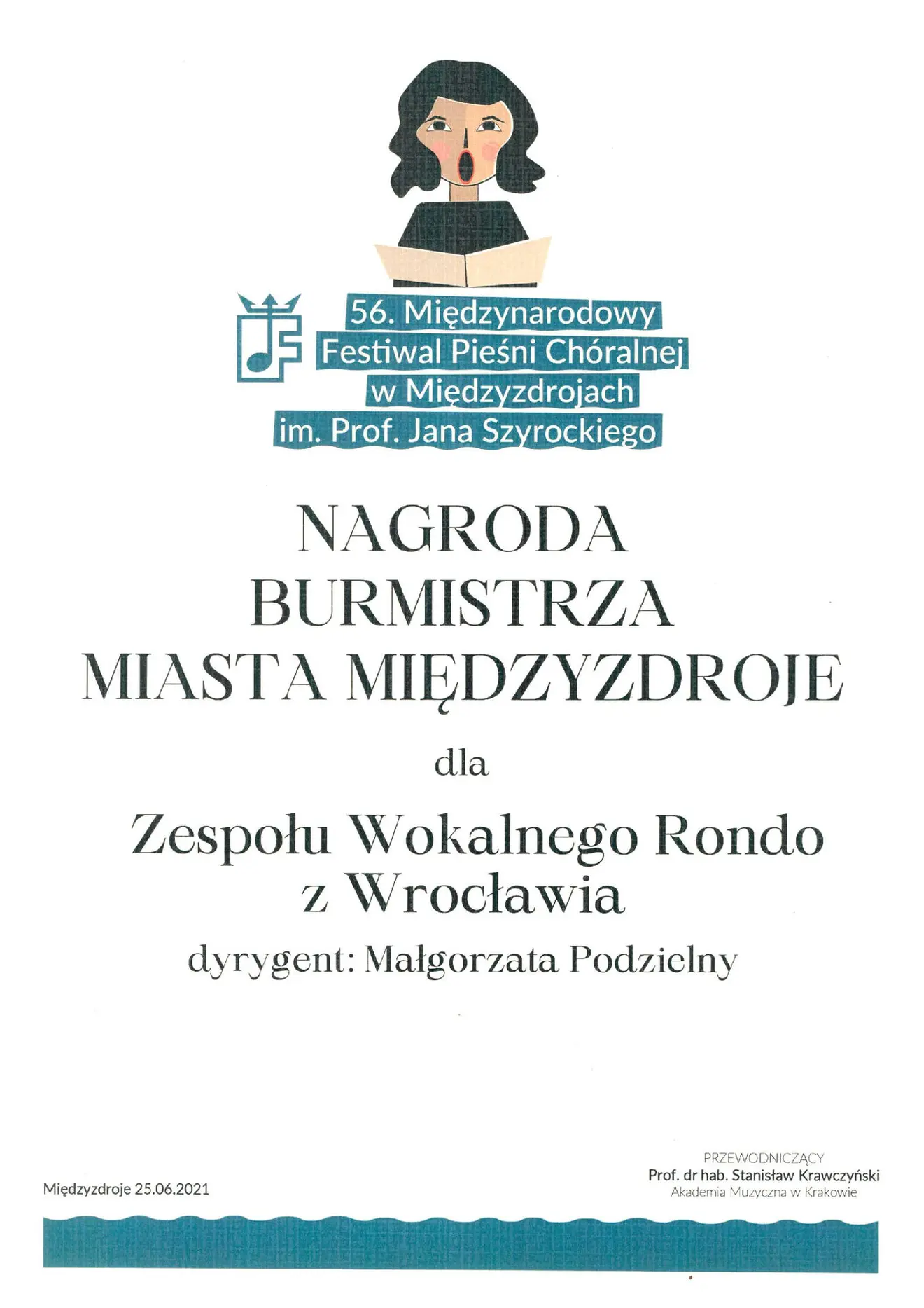 - Złoty Dyplom, Nagroda Burmistrza Miasta Międzyzdroje oraz Złoty Dyplom Konkursu MUSICA SACRA podczas 56. Międzynarodowego Festiwalu Pieśni Chóralnej w Międzyzdrojach im. Prof. Jana Szyrockiego (25 VI 2021).