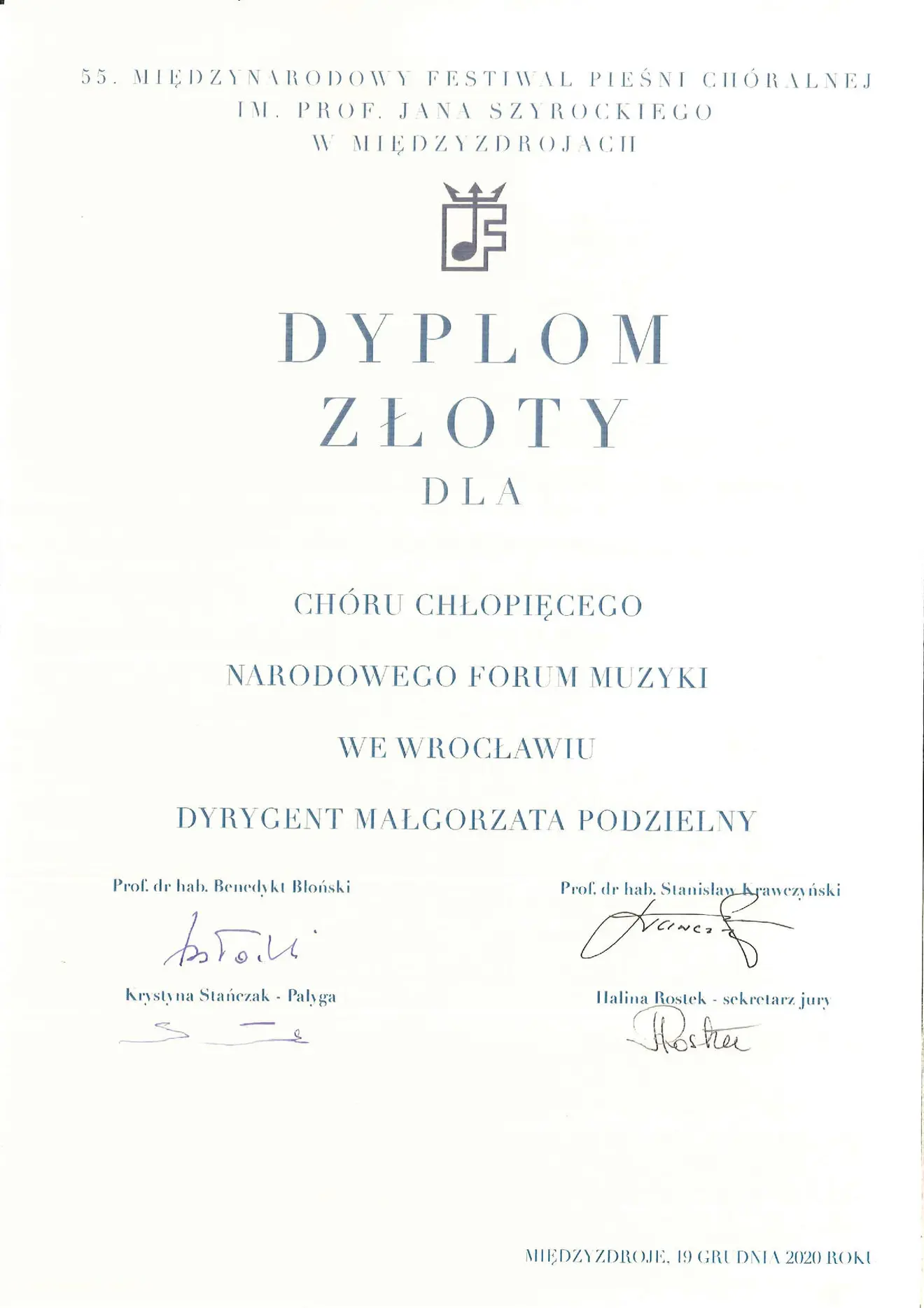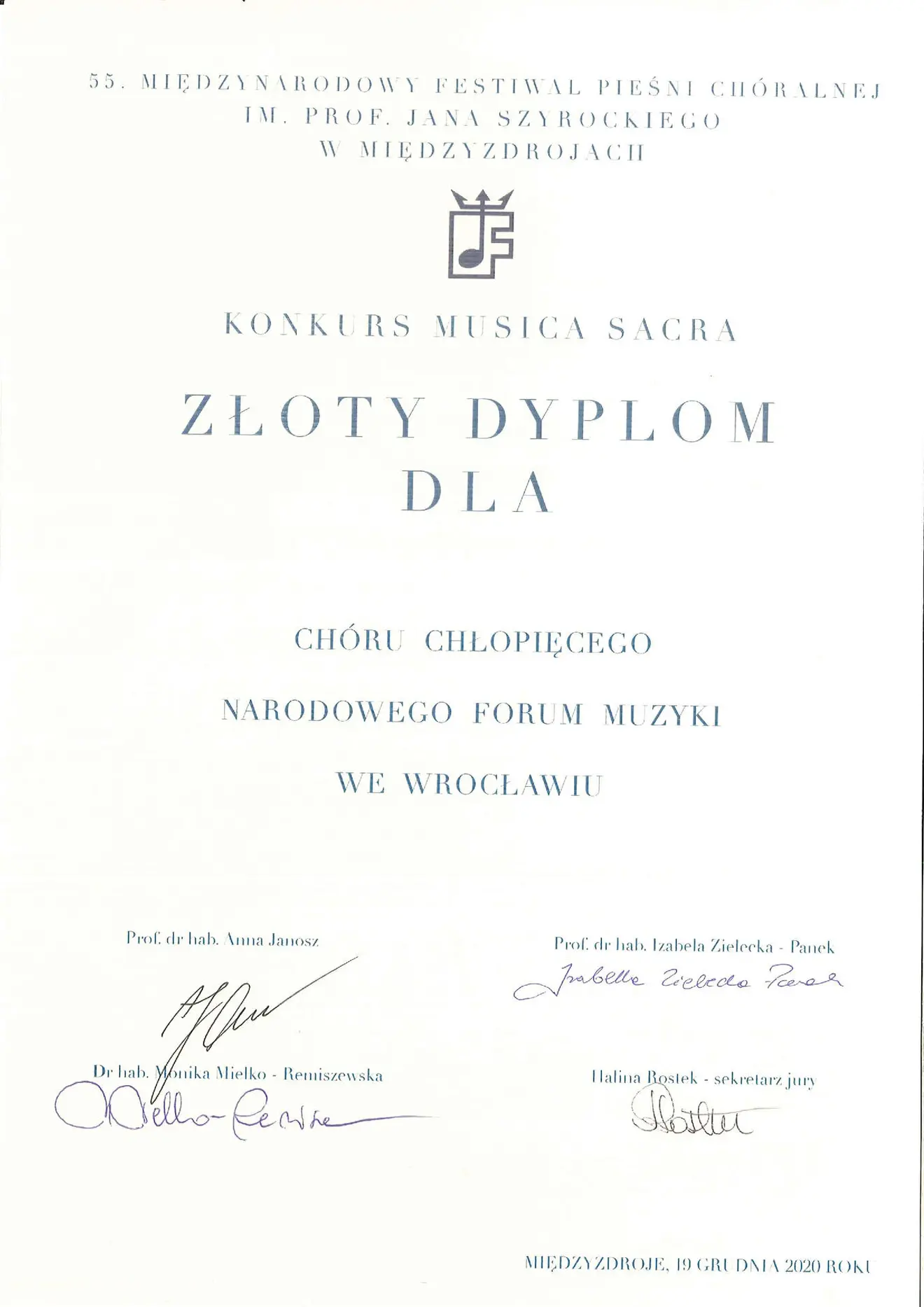 - Złoty Dyplom, Puchar Polskiego Związku Chórów i Orkiestr, Złoty Dyplom Konkursu MUSICA SACRA podczas 55. Międzynarodowego Festiwalu Pieśni Chóralnej w Międzyzdrojach im. Prof. Jana Szyrockiego – online (17-20 XII 2020).