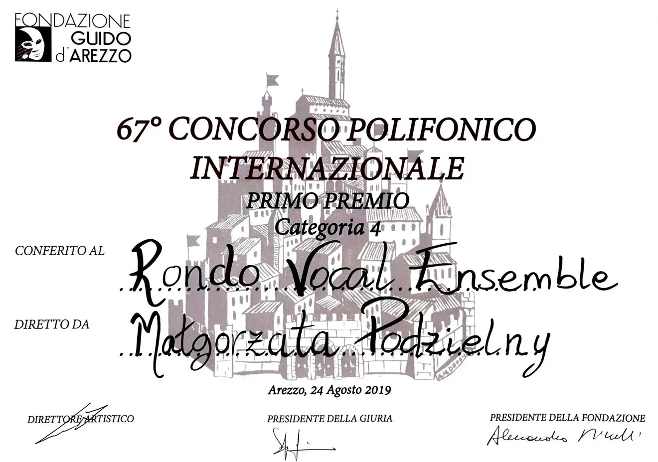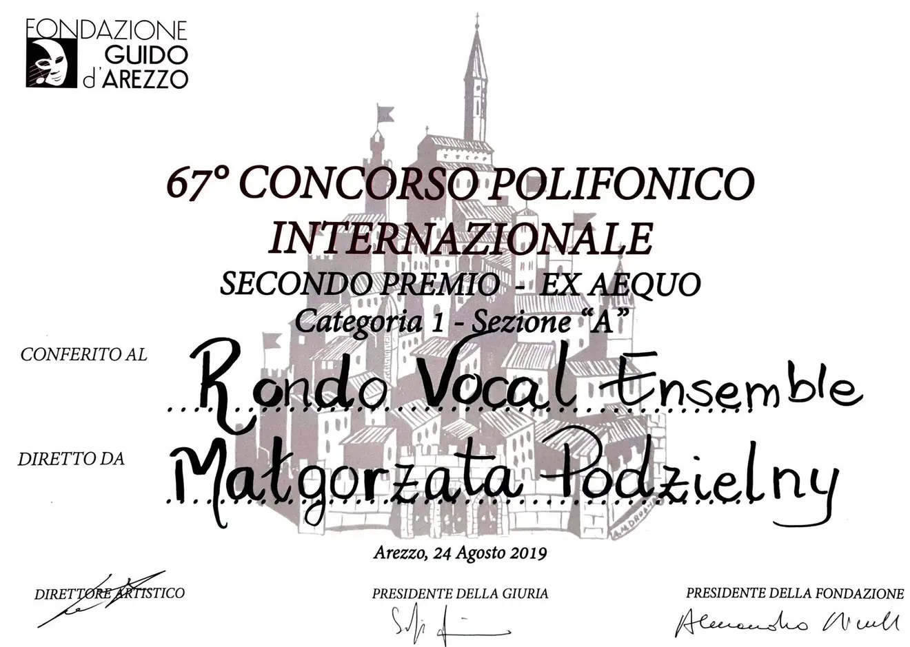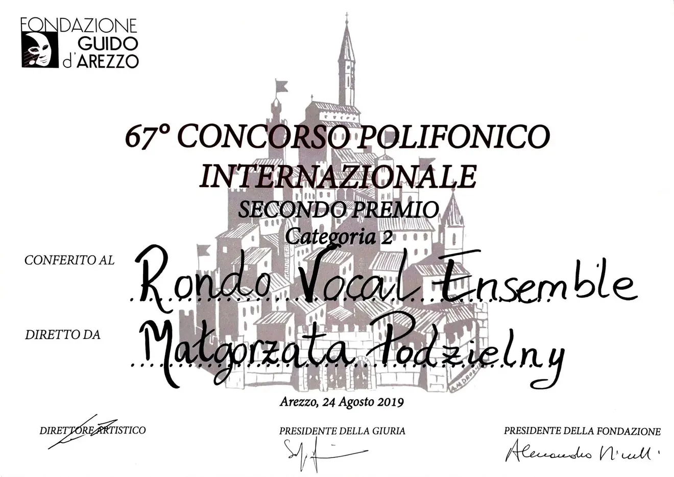 Zespół Wokalny „Rondo” Szkoły Muzycznej I stopnia im. G. Bacewicz we Wrocławiu pod dyrekcją Małgorzaty Podzielny - pedagog AMKL, Katedra Chóralistyki i Prowadzenia Zespołów, dyrygentura chóralna, podczas 67. Międzynarodowego Konkursu w Arezzo zdobył:
