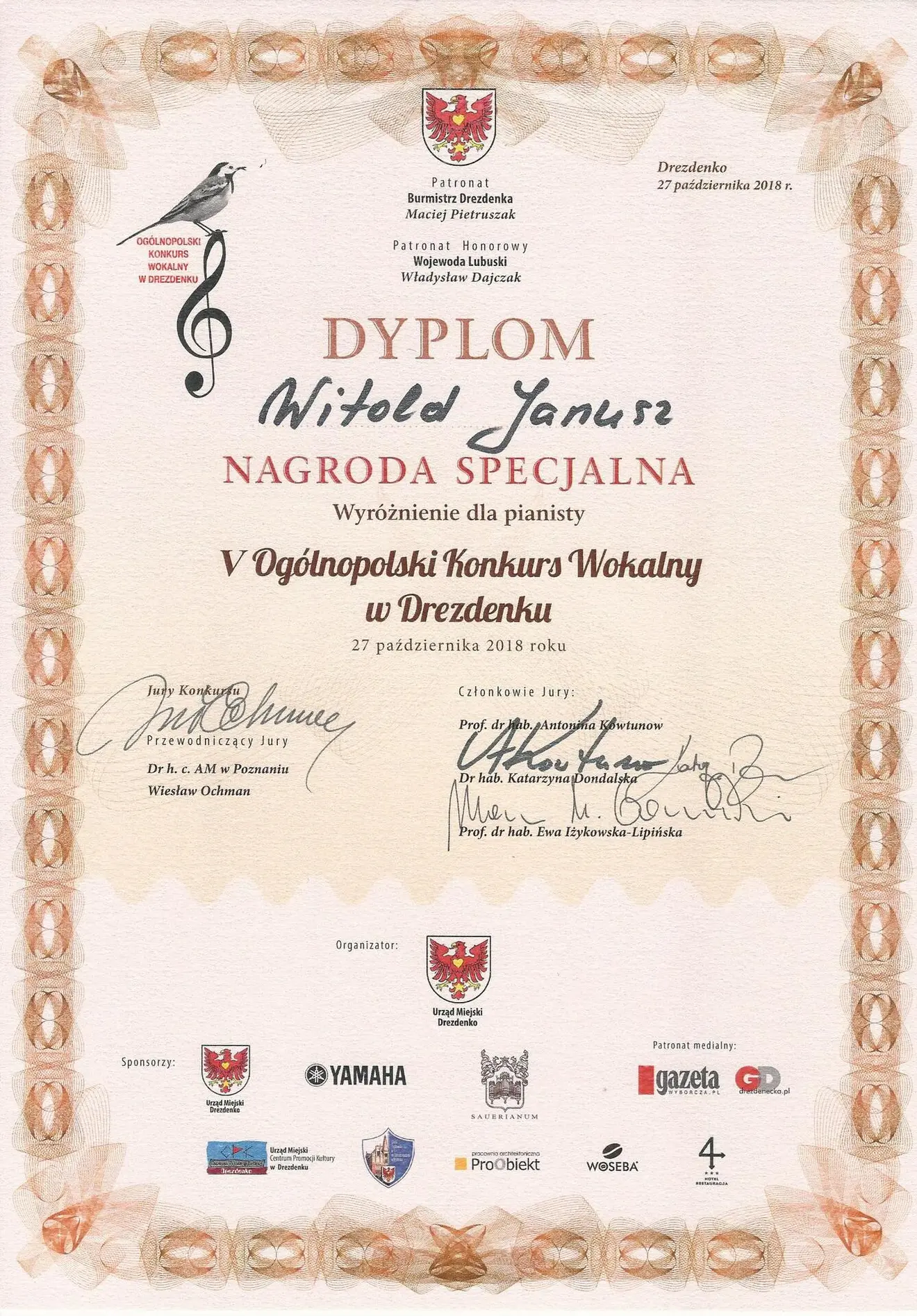 Dr Witold Janusz otrzymał nagrodę specjalną - wyróżnienie dla pianisty - podczas V Ogólnopolskiego Konkursu Wokalnego w Drezdenku, który odbył się 27 października 2018 roku.