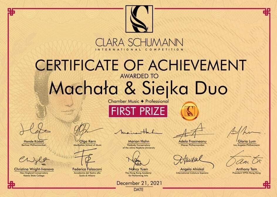 Mgr Alicja Siejka (fortepian) oraz Patrycja Machała, studentka klasy wiolonczeli prof. dr hab. Lidii Grzanki-Urbaniak, zajęły I miejsce podczas Clara Schumann International Competition.