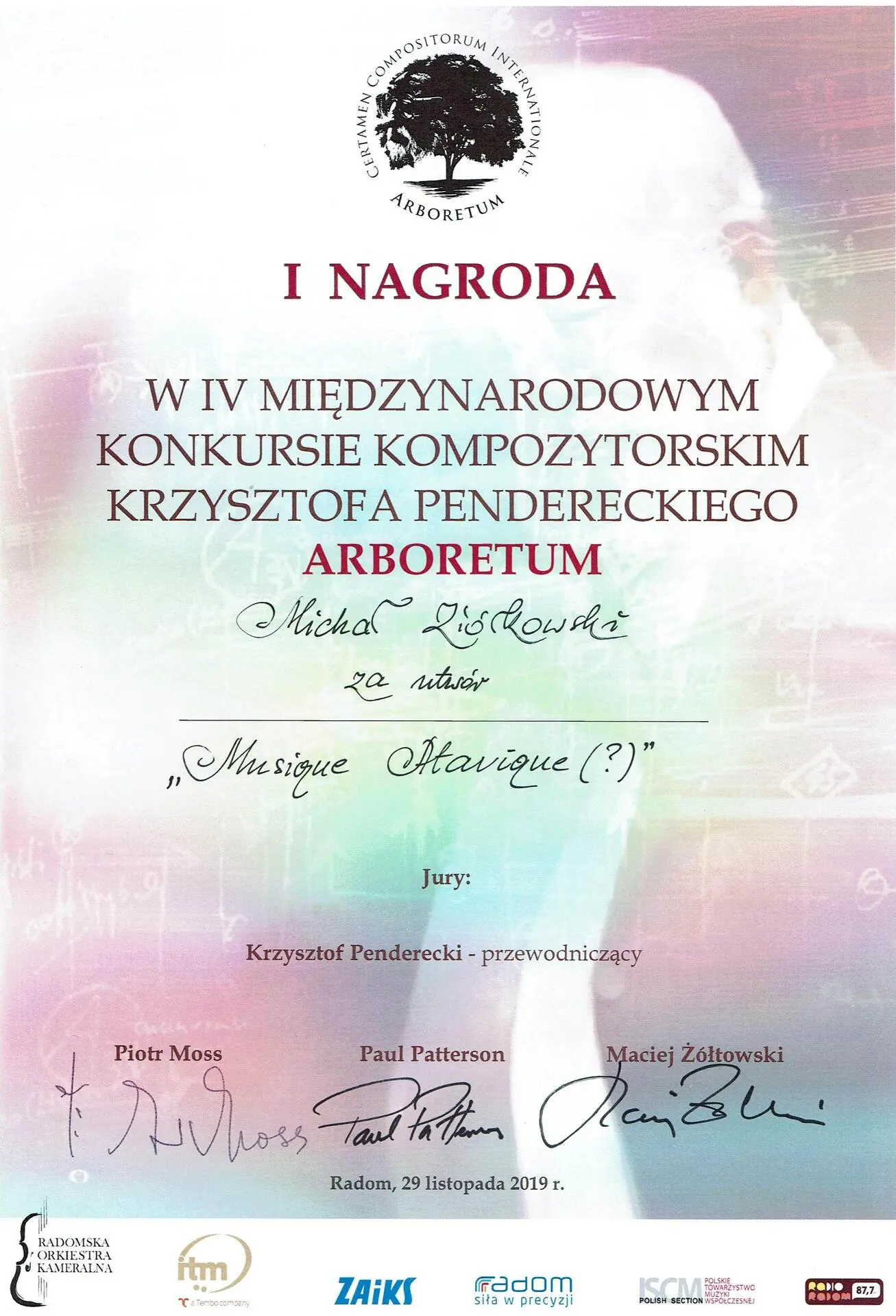 Michał Ziółkowski zdobył Grand Prix i został laureatem I Nagrody IV Międzynarodowego Konkursu Kompozytorskiego Krzysztofa Pendereckiego „Arboretum”.