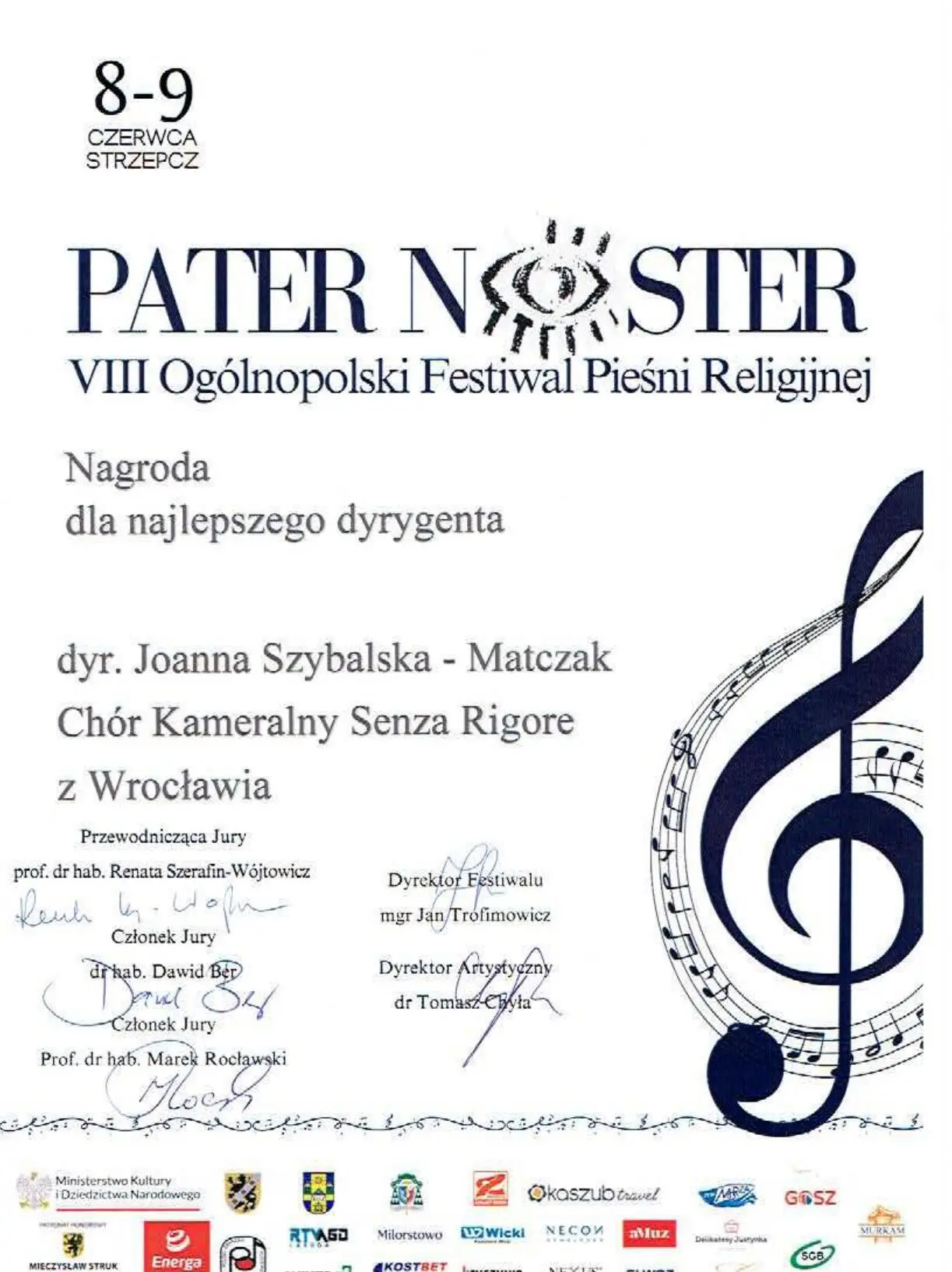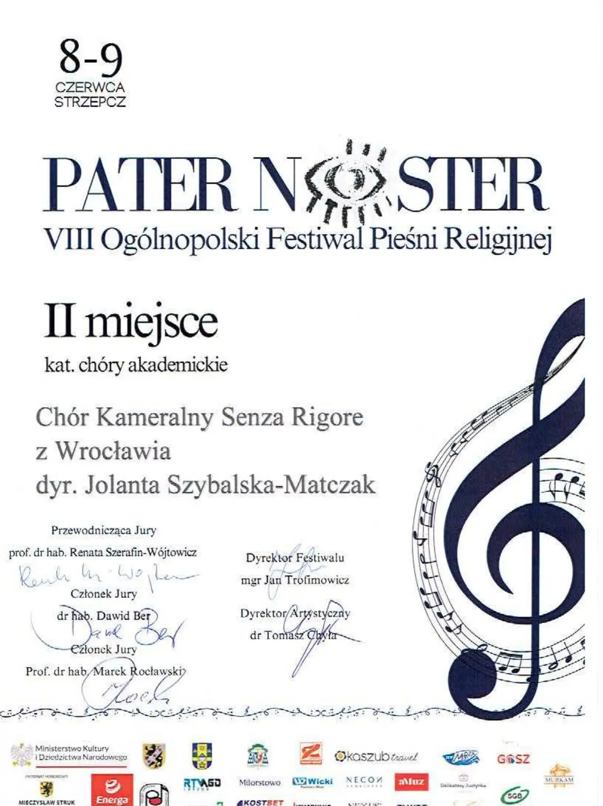 Prof. dr hab. Jolanta Szybalska-Matczak z Chórem Kameralnym Senza Rigore podczas VIII Ogólnopolskiego Festiwalu Pieśni Religijnej Pater Noster w Strzepczu (8-9 czerwca) zdobyła: