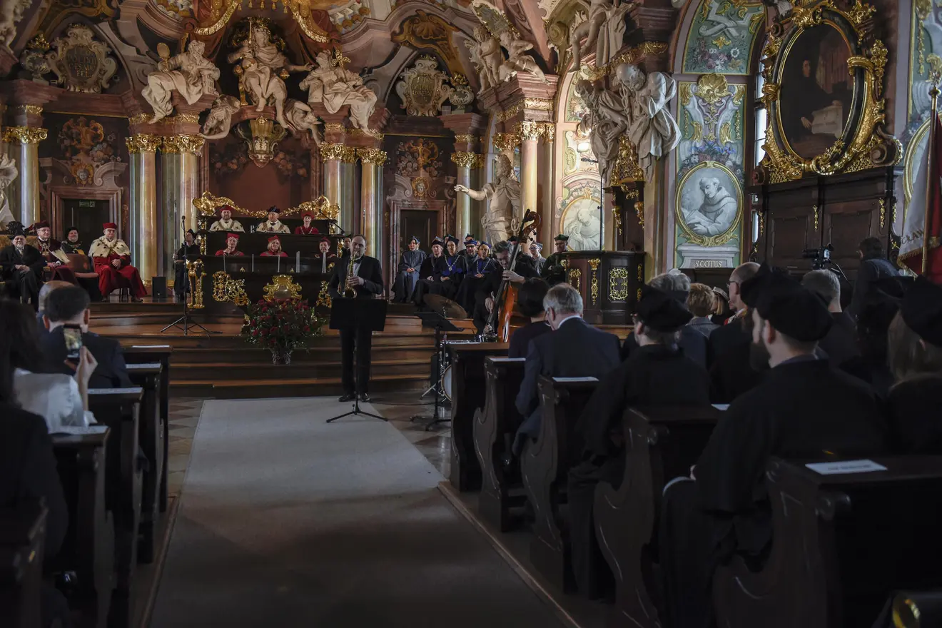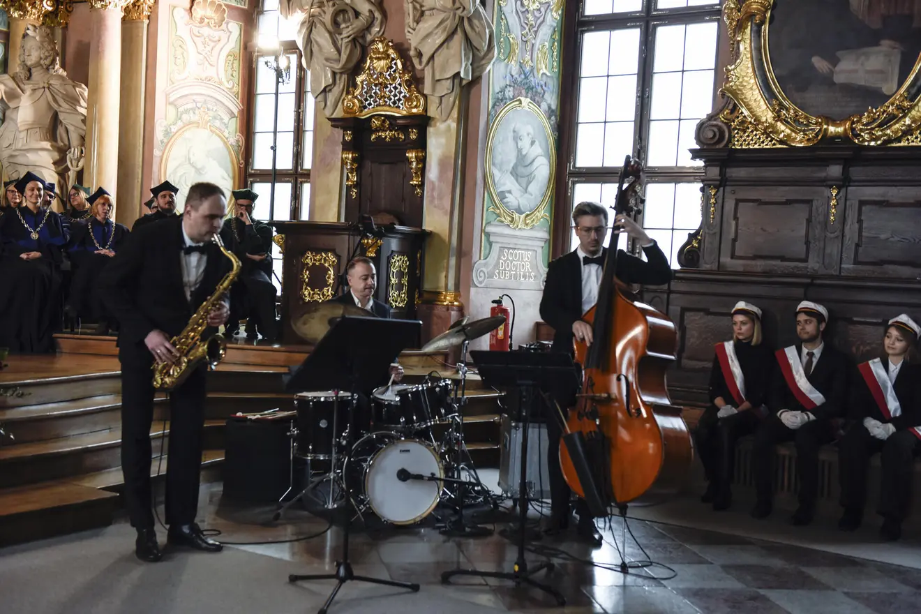 The ceremony featured a performance by the distinguished jazz band "Tomasz Wendt Trio," featuring Tomasz Wendt on tenor saxophone, Grzegorz Piasecki on double bass, and Przemysław Jarosz on drums. The musicians performed compositions by Jan "Ptaszyn" Wróblewski, Honorary Doctor of AMKL.