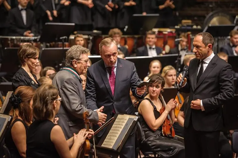 The concert featured performances of Adam Porębski's "Hierophonos F-E-C-H," dedicated to the first Rector of the Academy and awarded a prize in the student composition competition, as well as Anton Bruckner's "Te Deum," Rolf Liebermann's "Concerto for Jazz Ensemble and Symphony Orchestra," and Wojciech Kilar's "Krzesany." The Special Jubilee Concert was presented again on October 27, 2013.