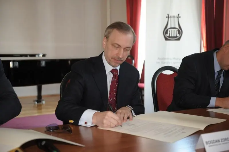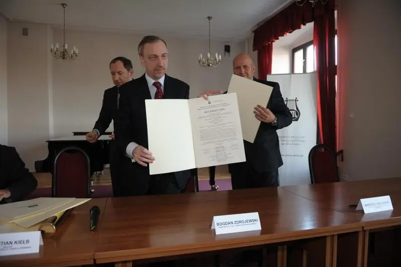 On September 26, 2011, the ceremony of signing the foundation act and laying the cornerstone for the construction of the Academy of Music in Wrocław's Concert and Educational Facility took place. The document was signed by Bogdan Zdrojewski, Minister of Culture and National Heritage, Professor Krystian Kiełb, Rector of the Academy of Music in Wrocław, Andrzej Goławski, Contractor's Representative, BUDIMEX S.A.'s Director of General Construction, Janusz Rybka, Contract Engineer, and Andrzej Krzysztof Barysz, Designer, M.Sc., Architect. Following the signing, the symbolic cornerstone laying ceremony for our new investment took place on the construction site, in the presence of representatives of Wrocław cultural institutions, representatives of higher education institutions, members of the Academy of Music Senate, and invited guests. The project, Expansion of the Academy of Music in Wrocław – construction of a music and teaching hall with infrastructure, is financed by the European Regional Development Fund and the Ministry of Culture and National Heritage.