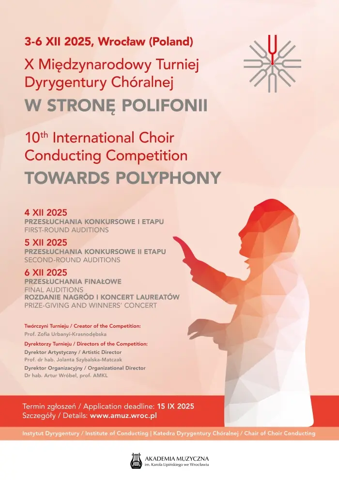 On 3–6 December 2025, the 10th International Choral Conducting Competition ‘Towards Polyphony’ took place in the Concert Hall of the Karol Lipiński Academy of Music in Wrocław. We encourage you to visit the Competition website and take part in the event.