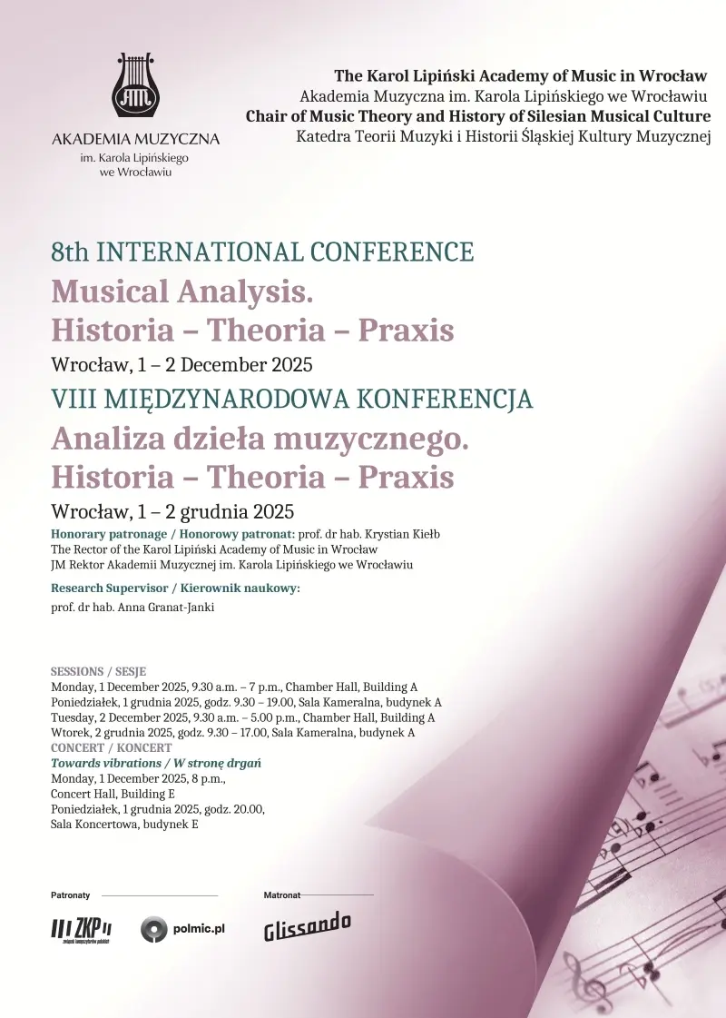 01 - 02.12.2025On 1–2 December 2025, the Karol Lipiński Academy of Music in Wrocław will host the 8th International Scientific Conference entitled ‘Analysis of Musical Works: History, Theory, Praxis’.
