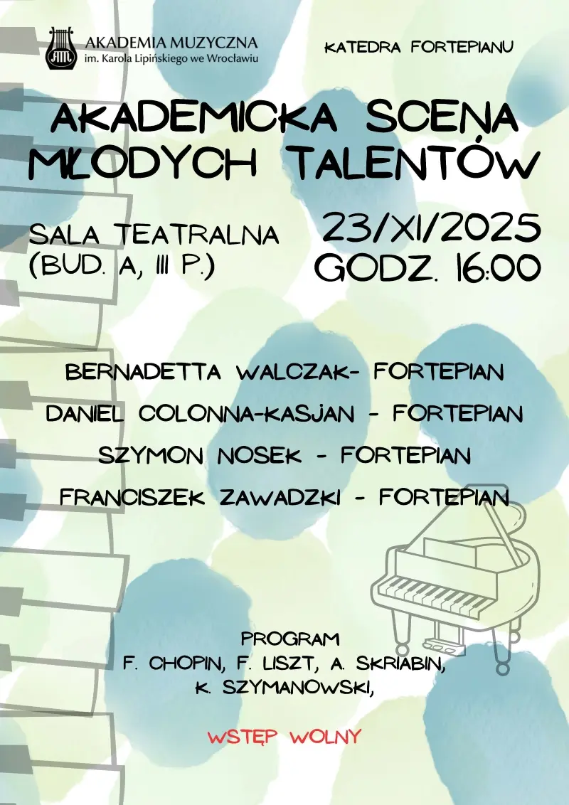 Wstęp wolnyWe invite you to listen to a concert by students of the Piano Department, held as part of the Academic Stage for Young Talents. The programme includes works by F. Chopin, F. Liszt, A. Scriabin and K. Szymanowski, among others.