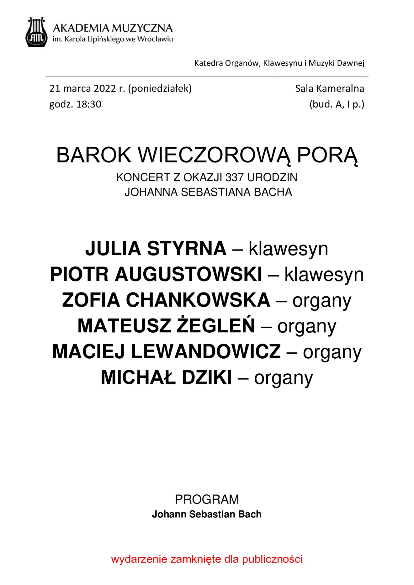 "Barok wieczorową porą" – koncert z okazji 337 urodzin J. S. Bacha