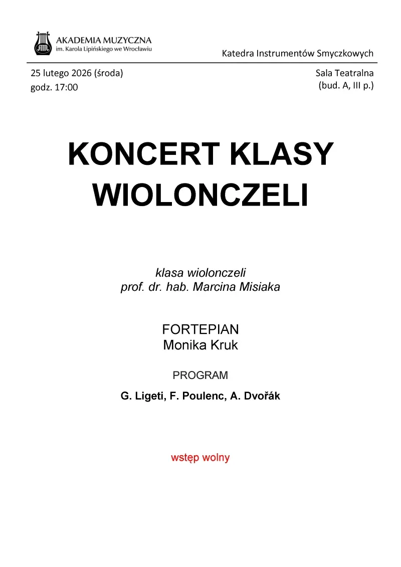 Free admissionWe invite you to listen to a concert by Prof. Marcin Misiak's cello class.