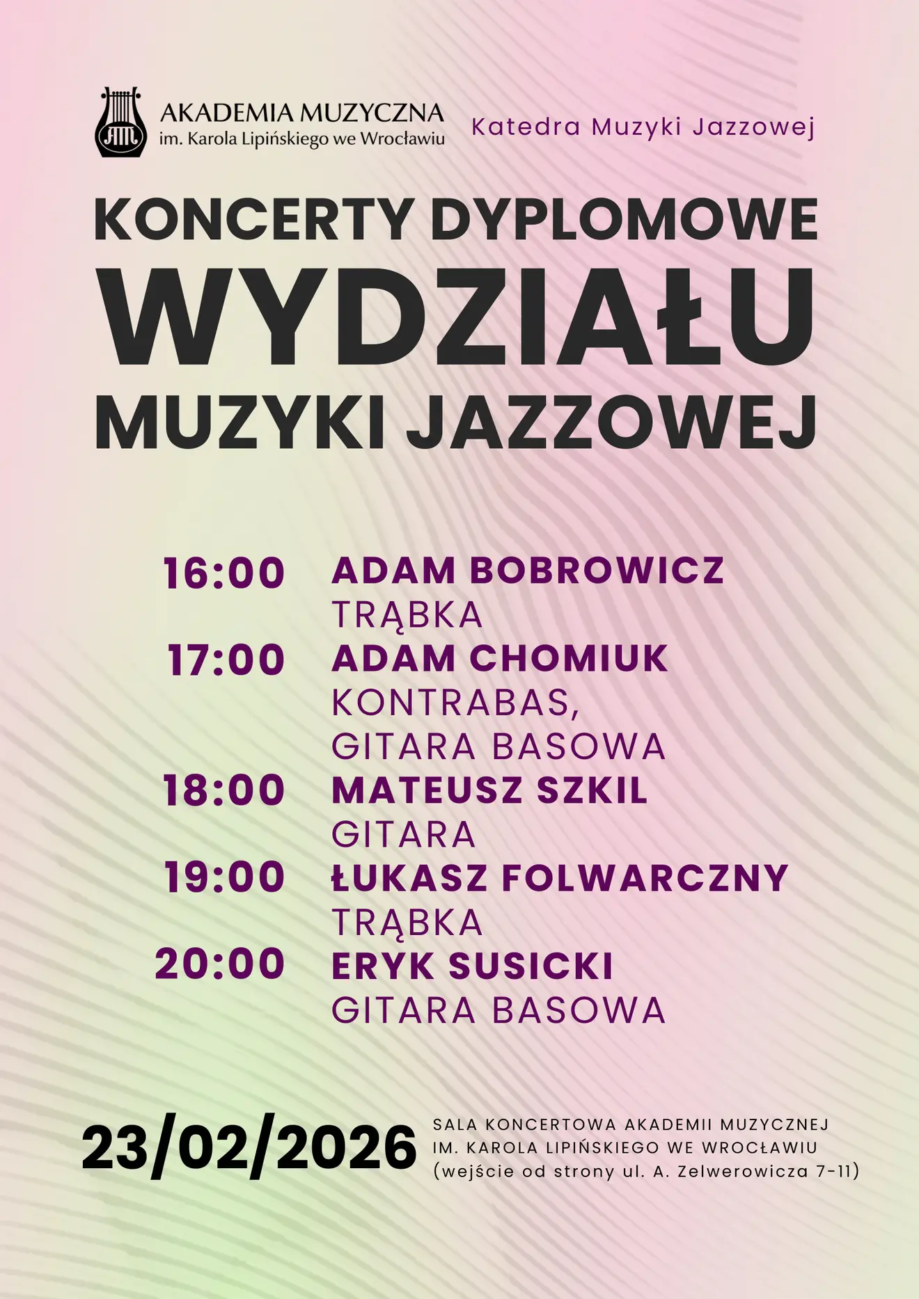 Free admissionWe invite you to listen to the Diploma Concerts of the Jazz Music Department. On 23 February 2026, the following artists will perform on the stage of our Academy's Concert Hall: