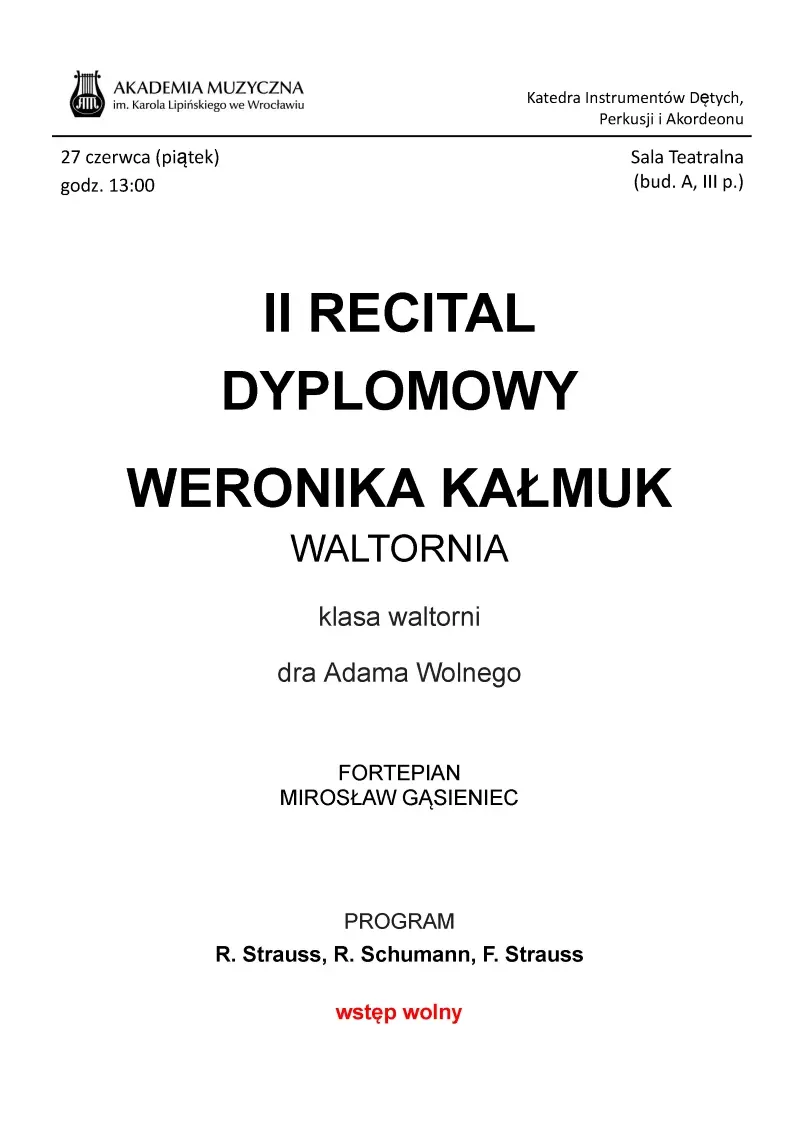 27.06.2025We warmly invite you to the diploma concerts of our students, which mark the culmination of their many years of study and artistic development at the Karol Lipiński Academy of Music in Wrocław.