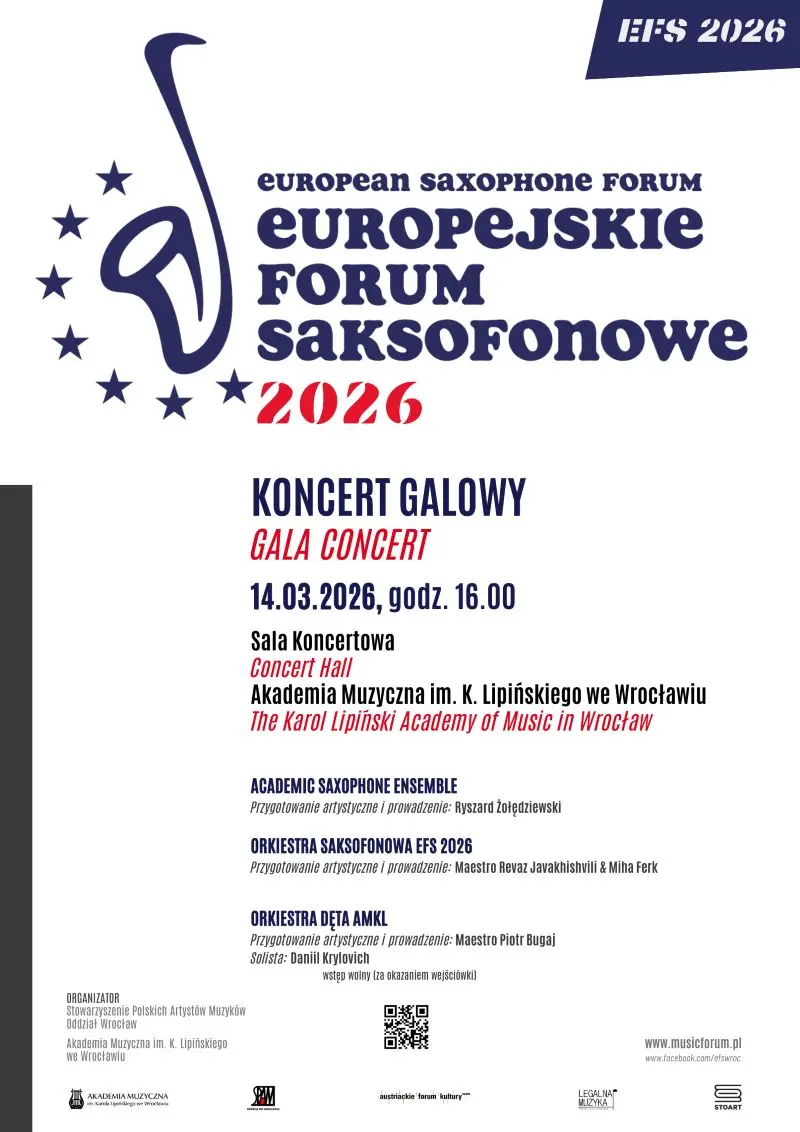 InvitationsOn March 14, 2026, at 4:00 p.m., the Karol Lipiński Academy of Music Concert Hall in Wrocław will host the Gala Concert of the European Saxophone Forum 2026. The Academic Saxophone Ensemble, the EFS 2026 Saxophone Orchestra, and the AMKL Wind Orchestra will perform on stage.