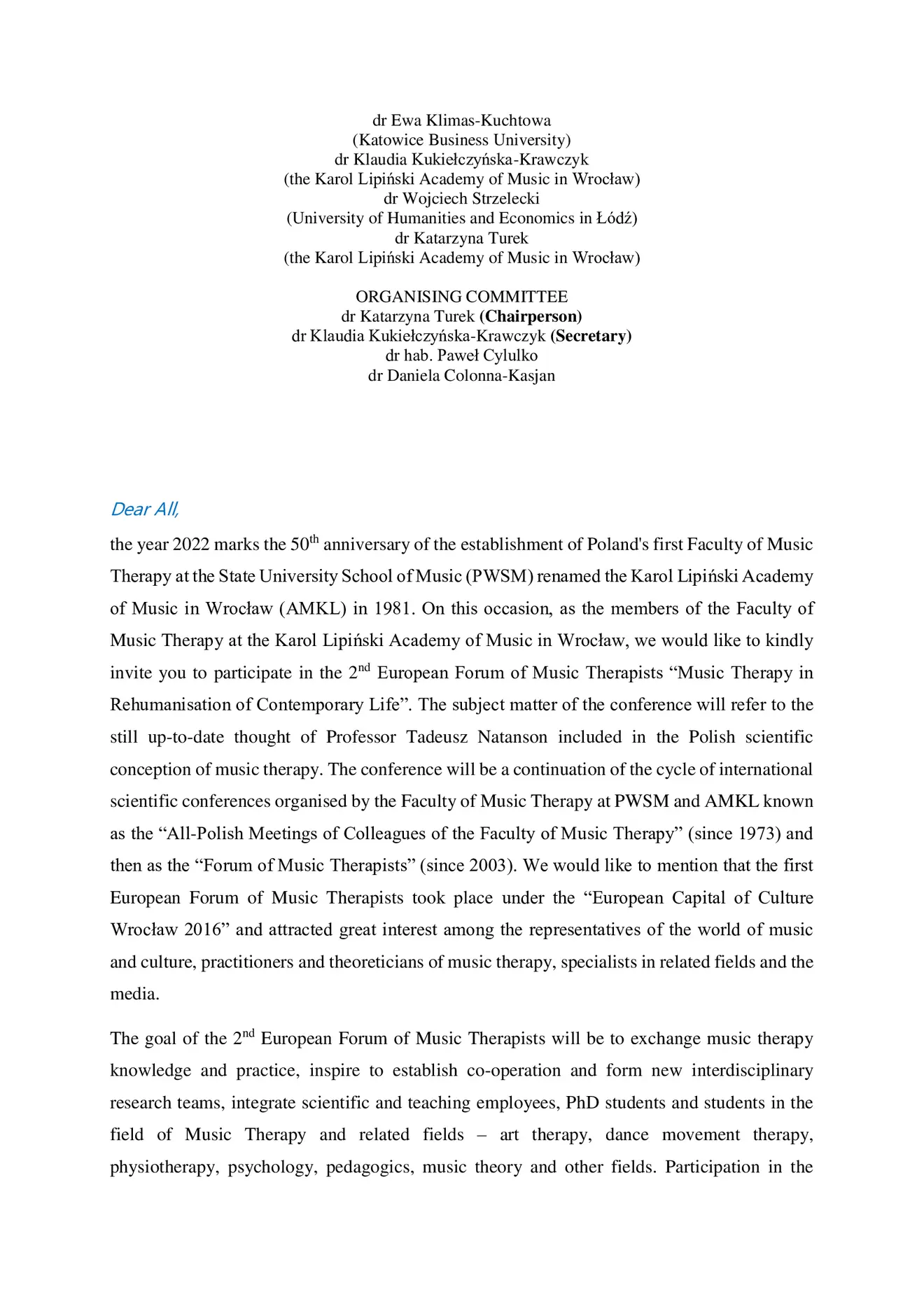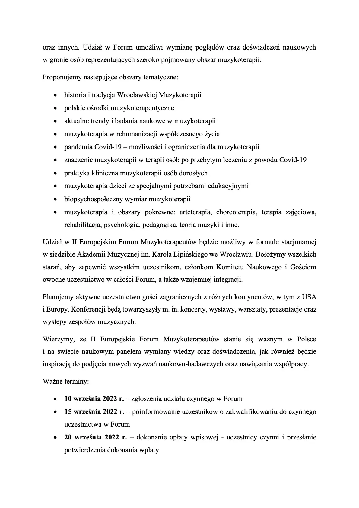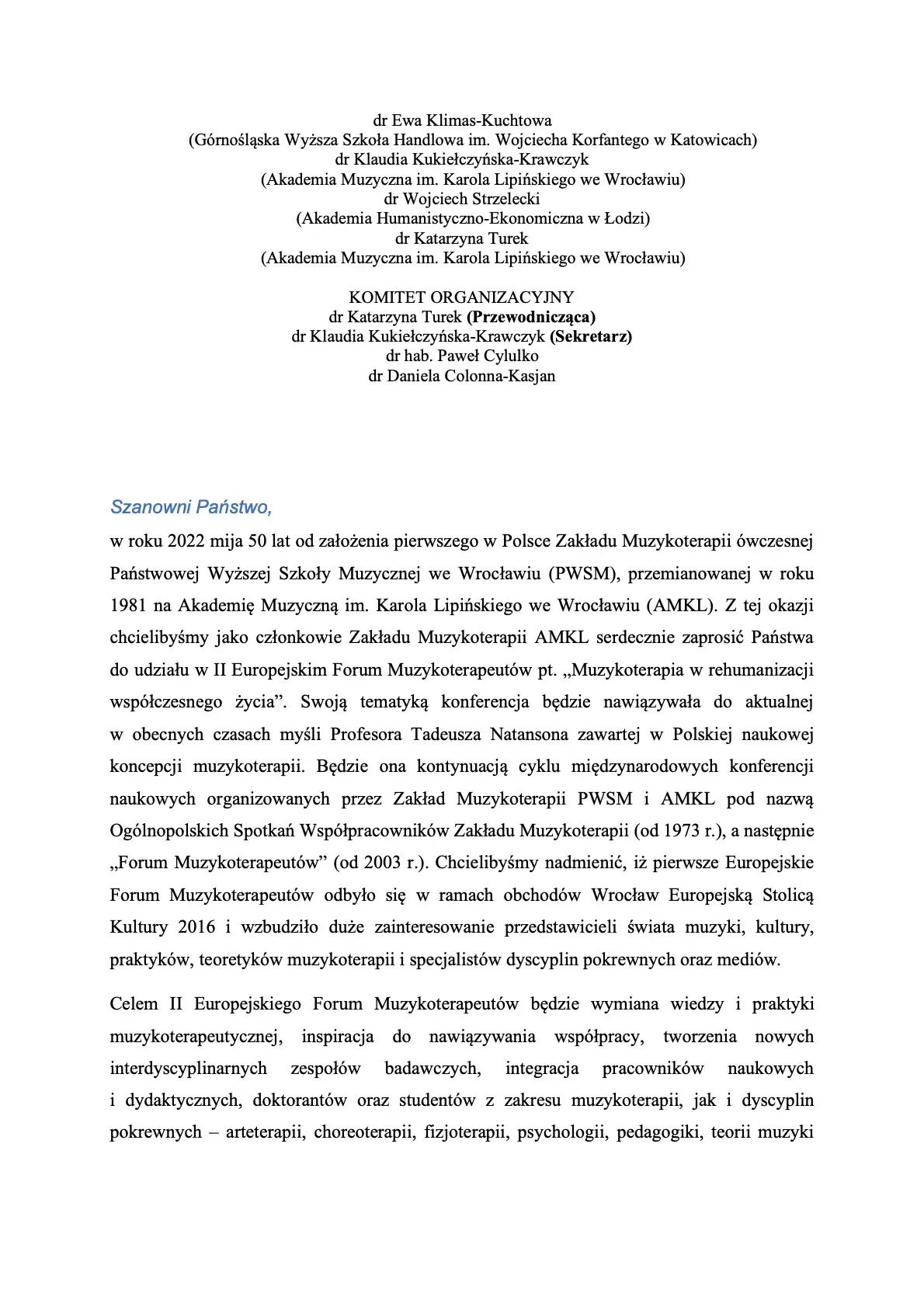 II Europejskie Forum Muzykoterapeutów "Muzykoterapia w rehumanizacji współczesnego życia"