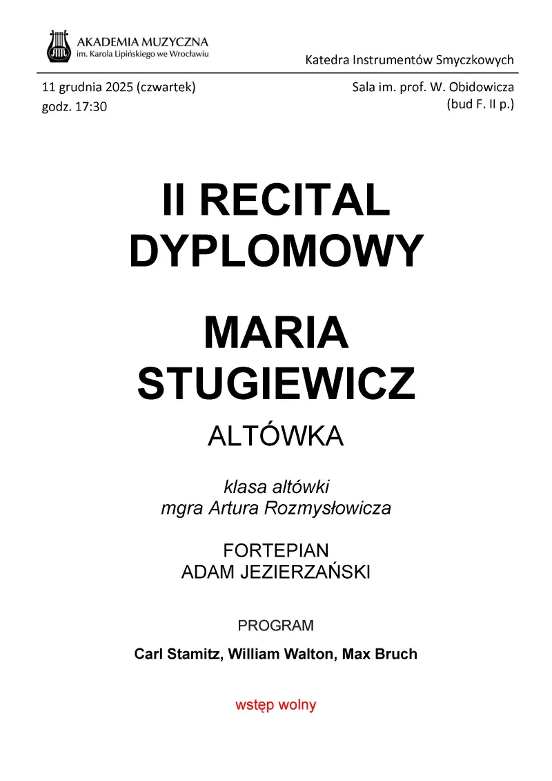 Free admissionWe invite you to Maria Stugiewicz's second diploma recital from Artur Rozmysłowicz's viola class.