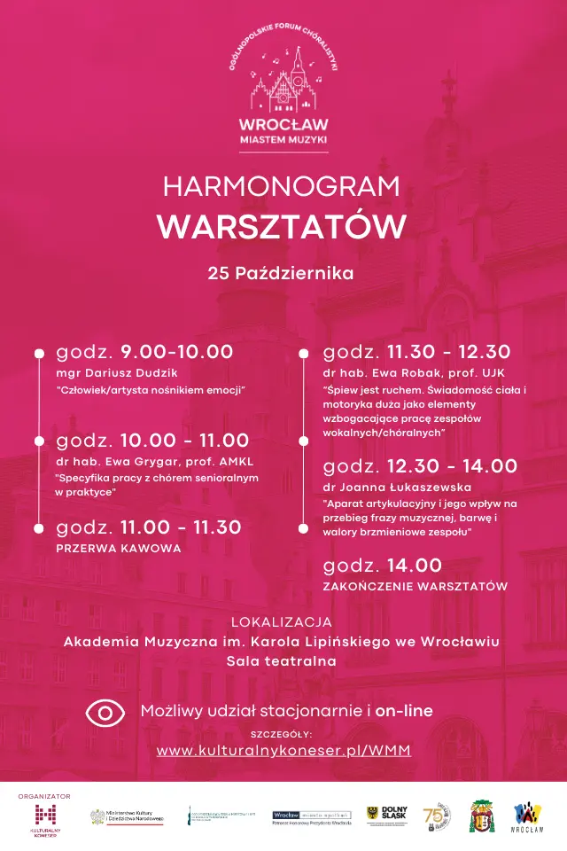 24 - 25.10.2023W siedzibie Akademii Muzycznej im. Karola Lipińskiego we Wrocławiu odbywa się Konferencja oraz warsztaty w ramach kolejnej edycji Ogólnopolskiego Forum Chóralistyki "Wrocław Miastem Muzyki" organizowanego przez Stowarzyszenie Animatorów Kultury „Kulturalny Koneser”. Odbędą się konkurs kompozytorski, konferencja, warsztaty, konkurs dla dyrygentów, konkurs chóralny oraz koncerty towarzyszące.