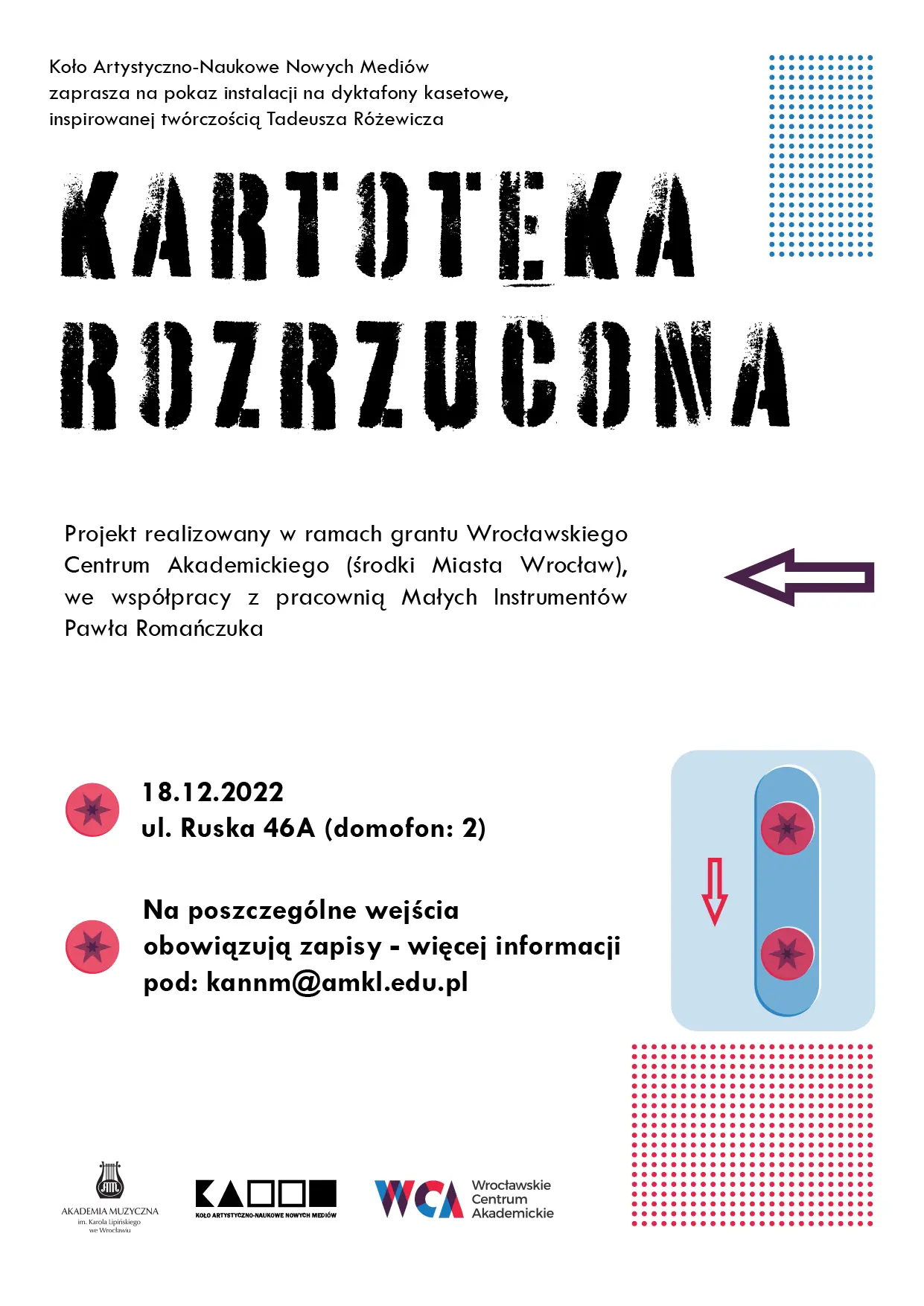 18.12.2022Koło Artystyczno-Naukowe Nowych Mediów zaprasza na pokaz instalacji na dyktafony kasetowe, inspirowanej twórczością Tadeusza Różewicza.