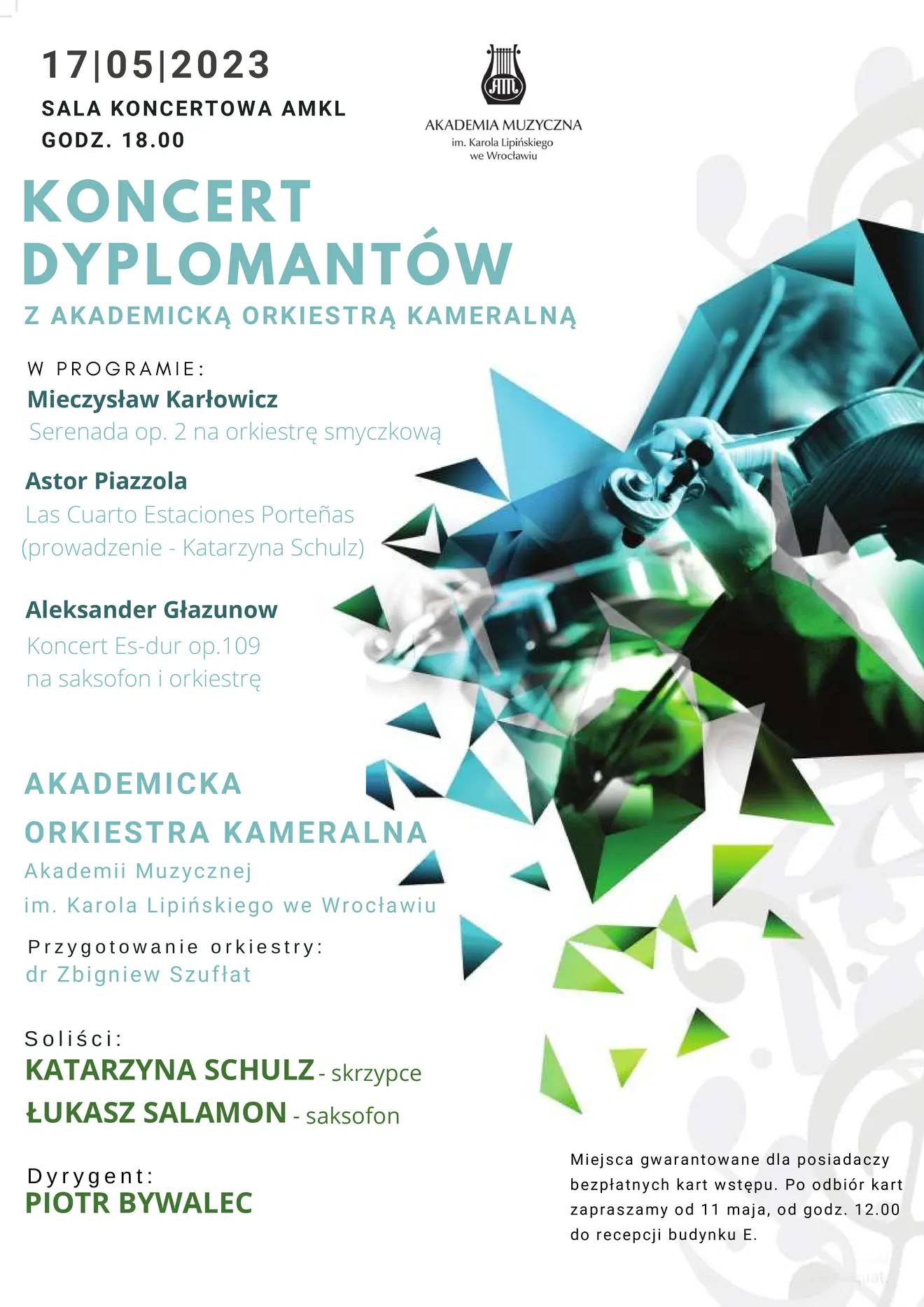 Zapraszamy na Koncert Dyplomantów z Akademicką Orkiestrą Kameralną, który odbędzie się już w najbliższą środę, tj. 17 maja o godz. 18.00 w Sali Koncertowej AMKL.