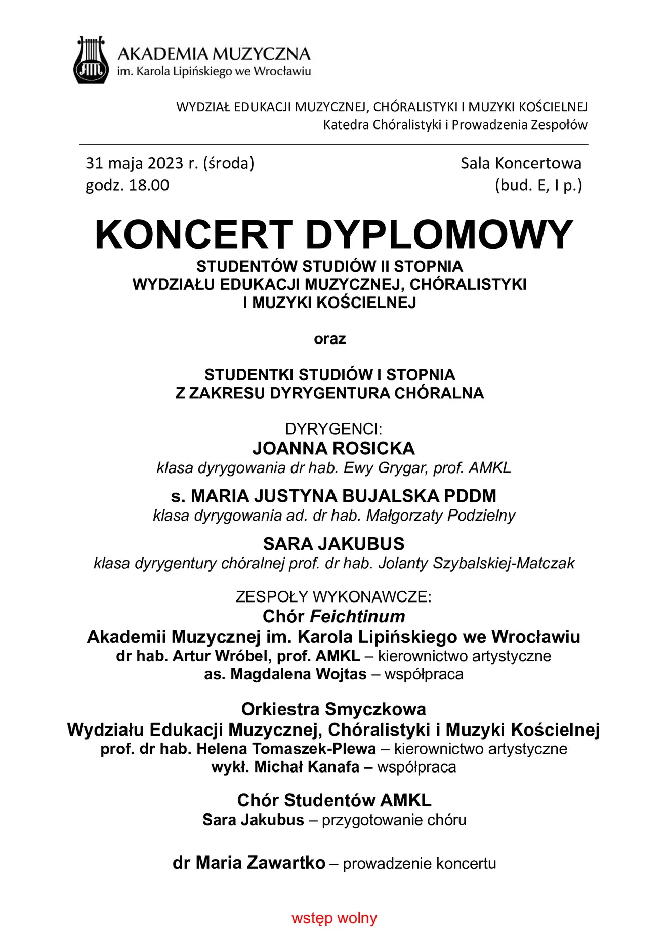 Koncert Dyplomowy studentów studiów II stopnia Wydziału Edukacji Muzycznej, Chóralistyki i Muzyki Kościelnej