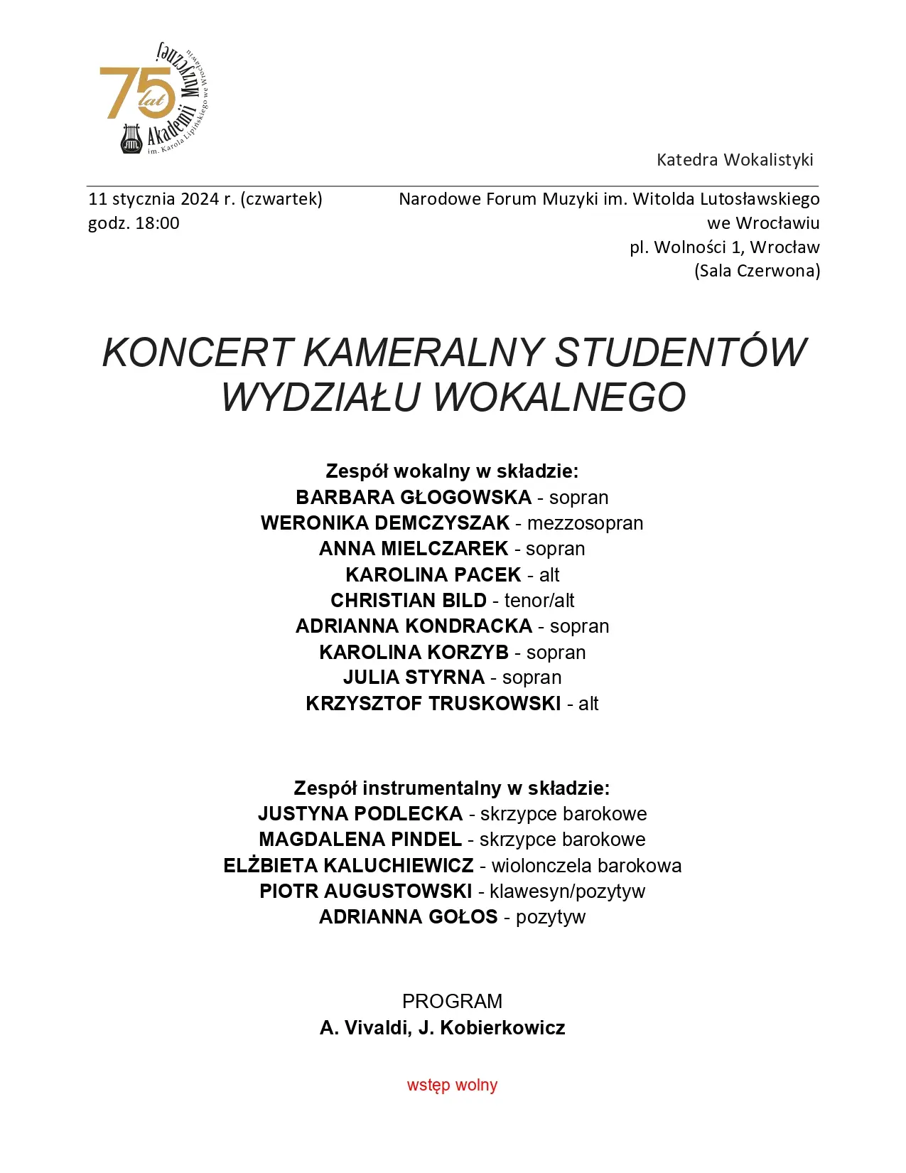 Koncert Kameralny Studentów Wydziału Wokalnego