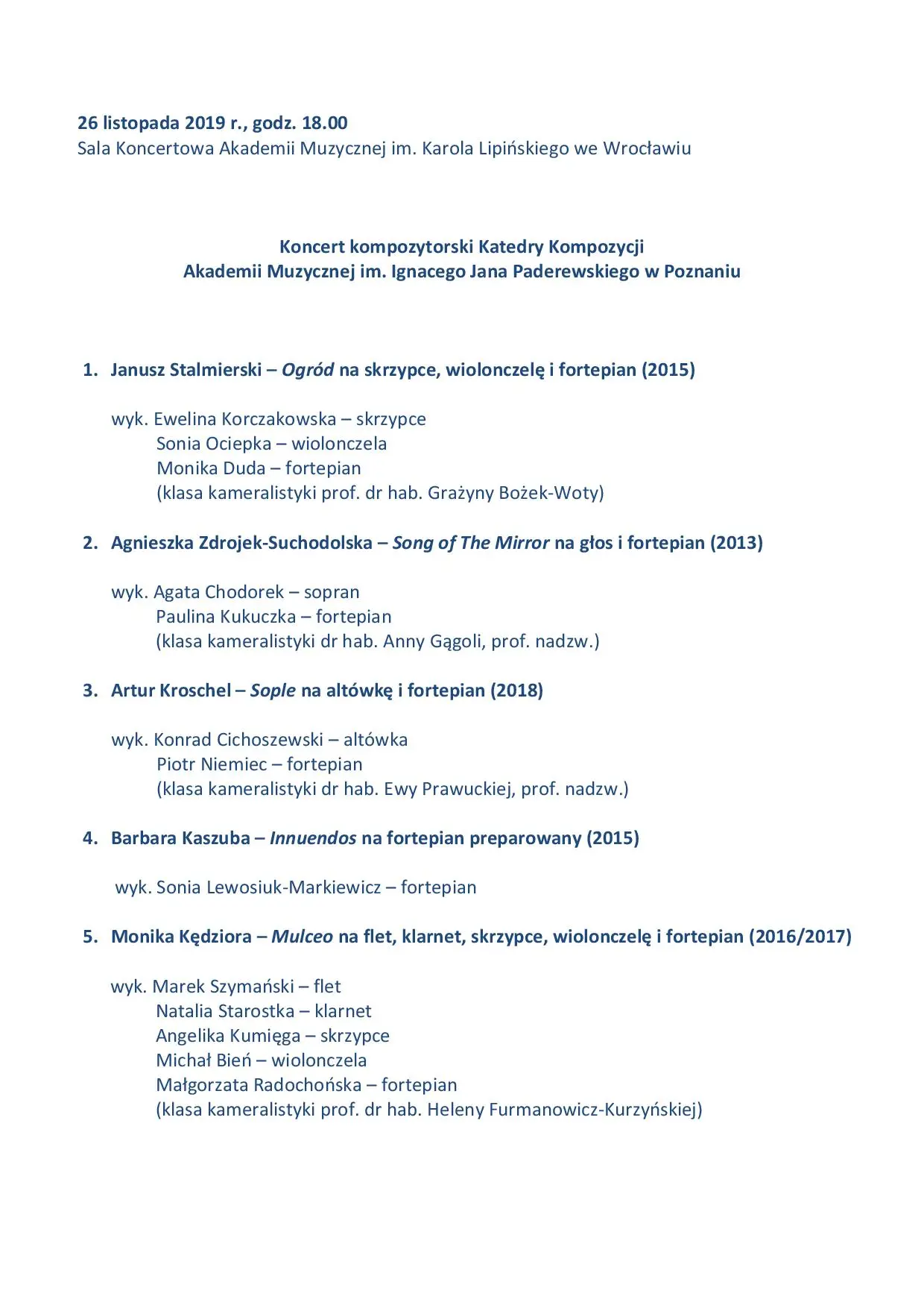 W programie utwory kompozytorów poznańskich w wykonaniu studentów i doktorantów Akademii Muzycznej im. Karola Lipińskiego we Wrocławiu: