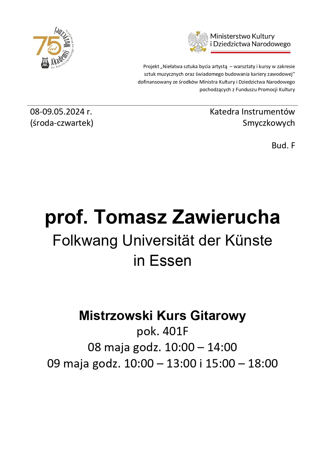 08 - 09.05.2024Projekt "Niełatwa sztuka bycia artystą - warsztaty i kursy w zakresie sztuk muzycznych oraz świadomego budowania kariery zawodowej" dofinansowany ze środków Ministra Kultury i Dziedzictwa Narodowego pochodzących z Funduszu Promocji Kultury – państwowego funduszu celowego