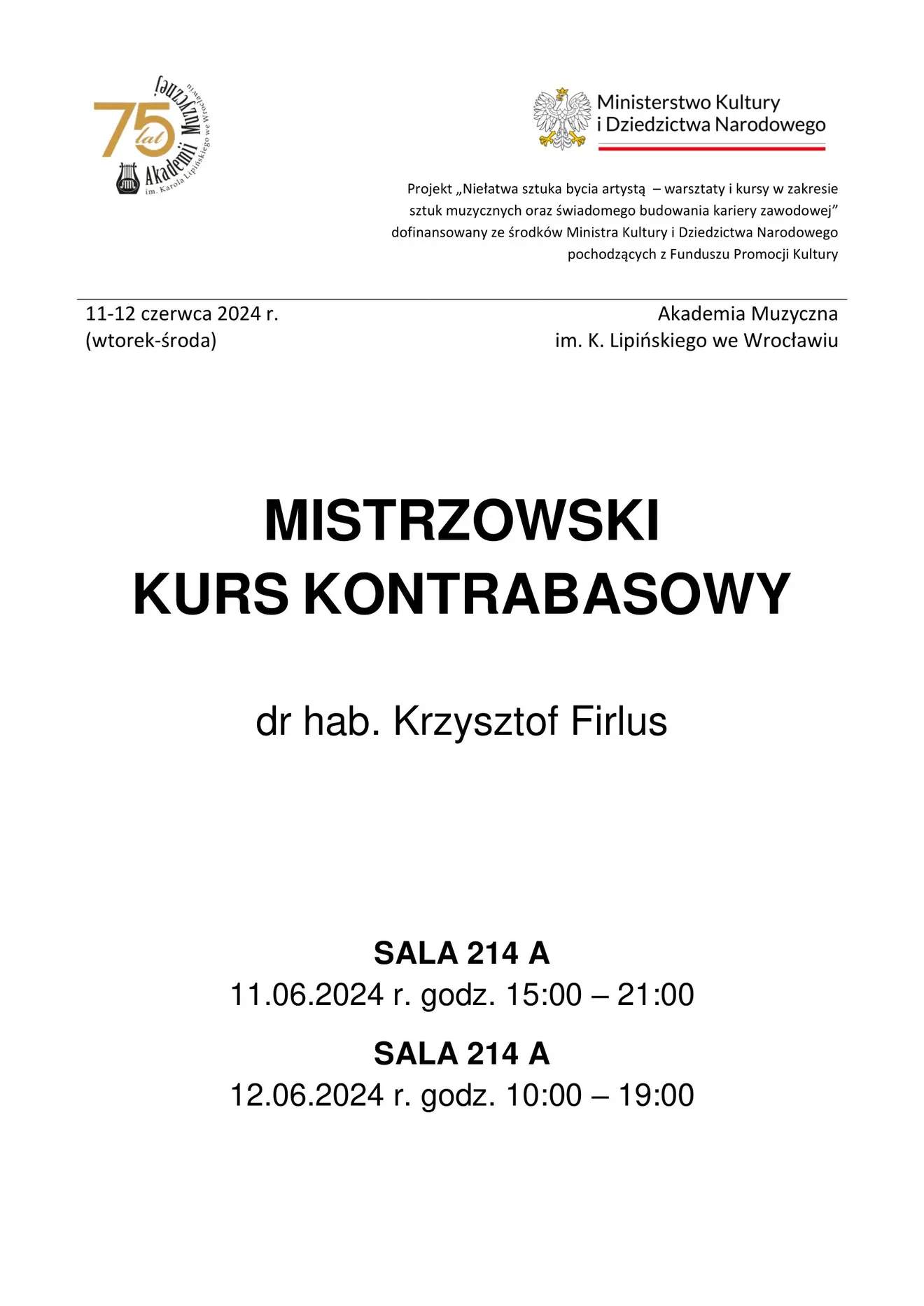 11 - 12.06.2024"Niełatwa sztuka bycia artystą - warsztaty i kursy w zakresie sztuk muzycznych oraz świadomego budowania kariery zawodowej" dofinansowany ze środków Ministra Kultury i Dziedzictwa Narodowego pochodzących z Funduszu Promocji Kultury – państwowego funduszu celowego.